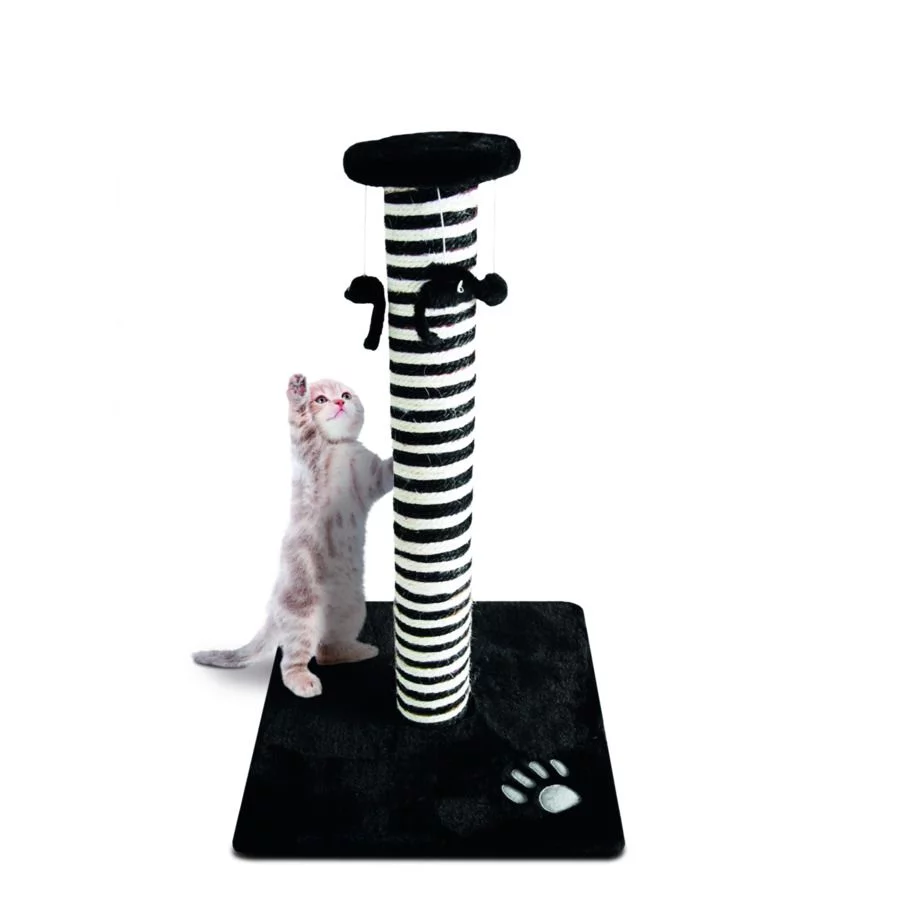 De krabpaal Eva is een vierkant bodemplateau met daarop een stam waar kittens aan kunnen krabben, spelen en hangen. Bovenaan de paal zijn muisjes bevestigd waarmee kan worden gespeeld, daardoor kan je kitten zich ook met de krabpaal vermaken als je zelf even van huis bent. Met een afmeting van 38 x 38 x 57.5 cm is dit niet een hele grote krabpaal, maar ideaal voor nog kleine katjes. De Eva is beschikbaar in de kleur zwart met wit.