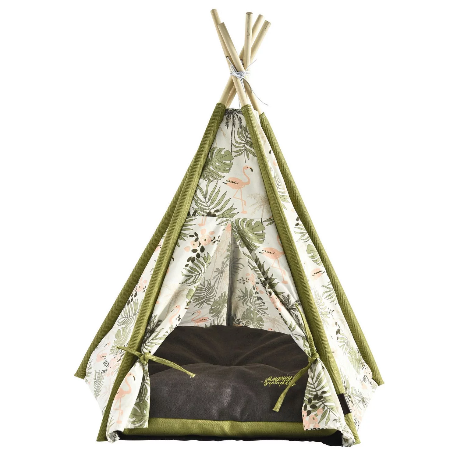 De Tipitent Verano van Adori is een vrolijke tipi voor je kat. Katten houden ervan om verstopt ergens te kunnen slapen, veilig van vijanden. In deze tent kunnen ze zich fijn terugtrekken en er ligt een zacht pluche kussentje in de tent om op te slapen. Het tentje blijft staan door middel van vijf houten stokken en is makkelijk in elkaar te zetten en op te bergen. Het tentdoek heeft een vrolijke tropische print.