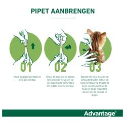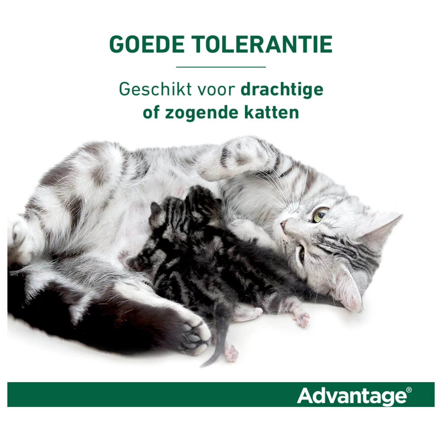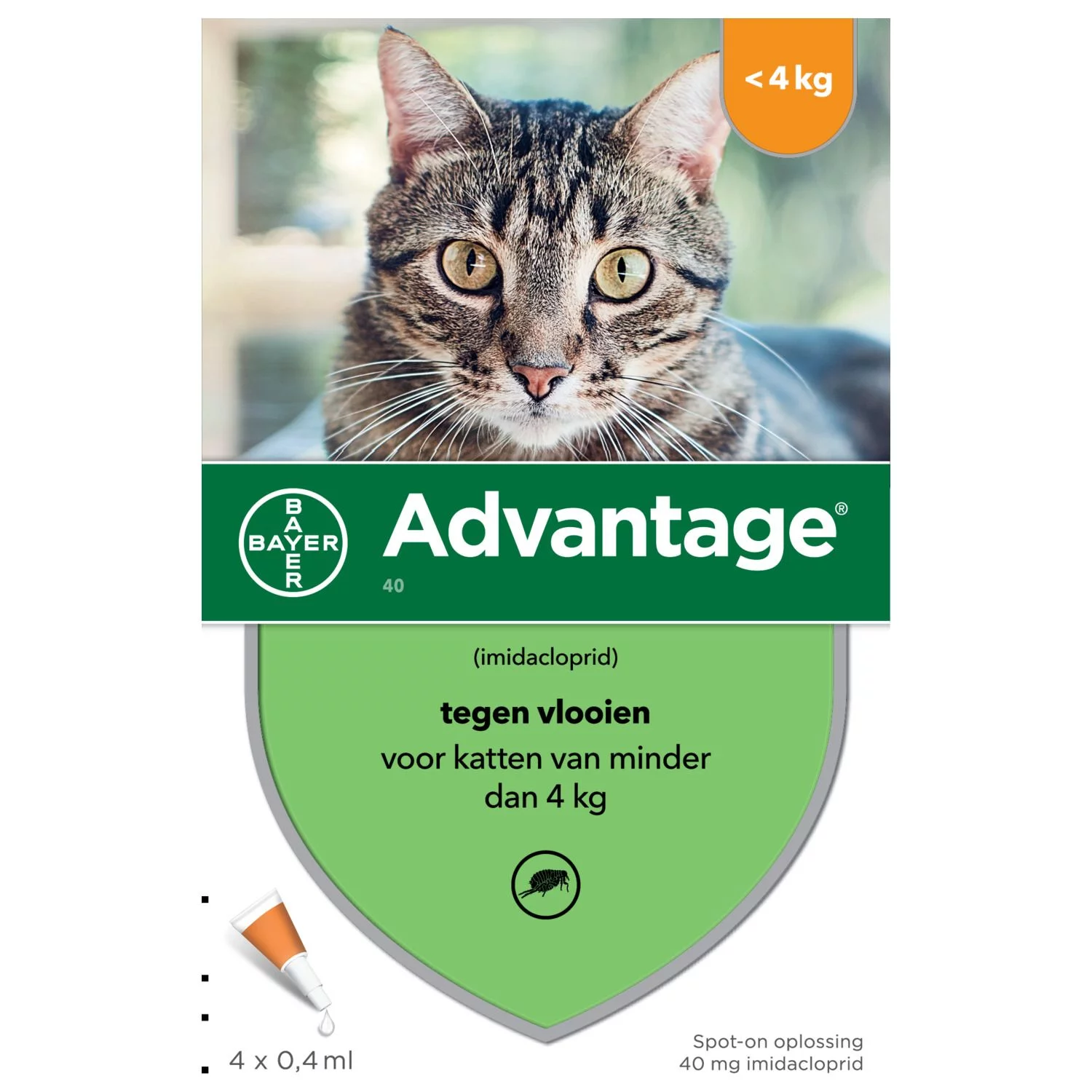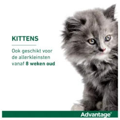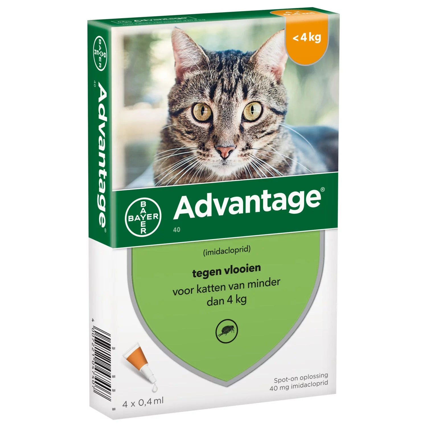Druppel de inhoud van de pipet tussen de haren op de intacte huid ter hoogte van de schedelbasis, lees voor gebruik de bijsluiter. Gebruik Advantage nooit bij kittens jonger dan 8 weken. De werkzame stof is imidacloprid, dit middel komt niet in de bloedsomloop van je kat terecht, maar wordt opgenomen in de vettige laag van de huid en vacht. Advantage bevat 4 pipetten is verkrijgbaar in 2 varianten: