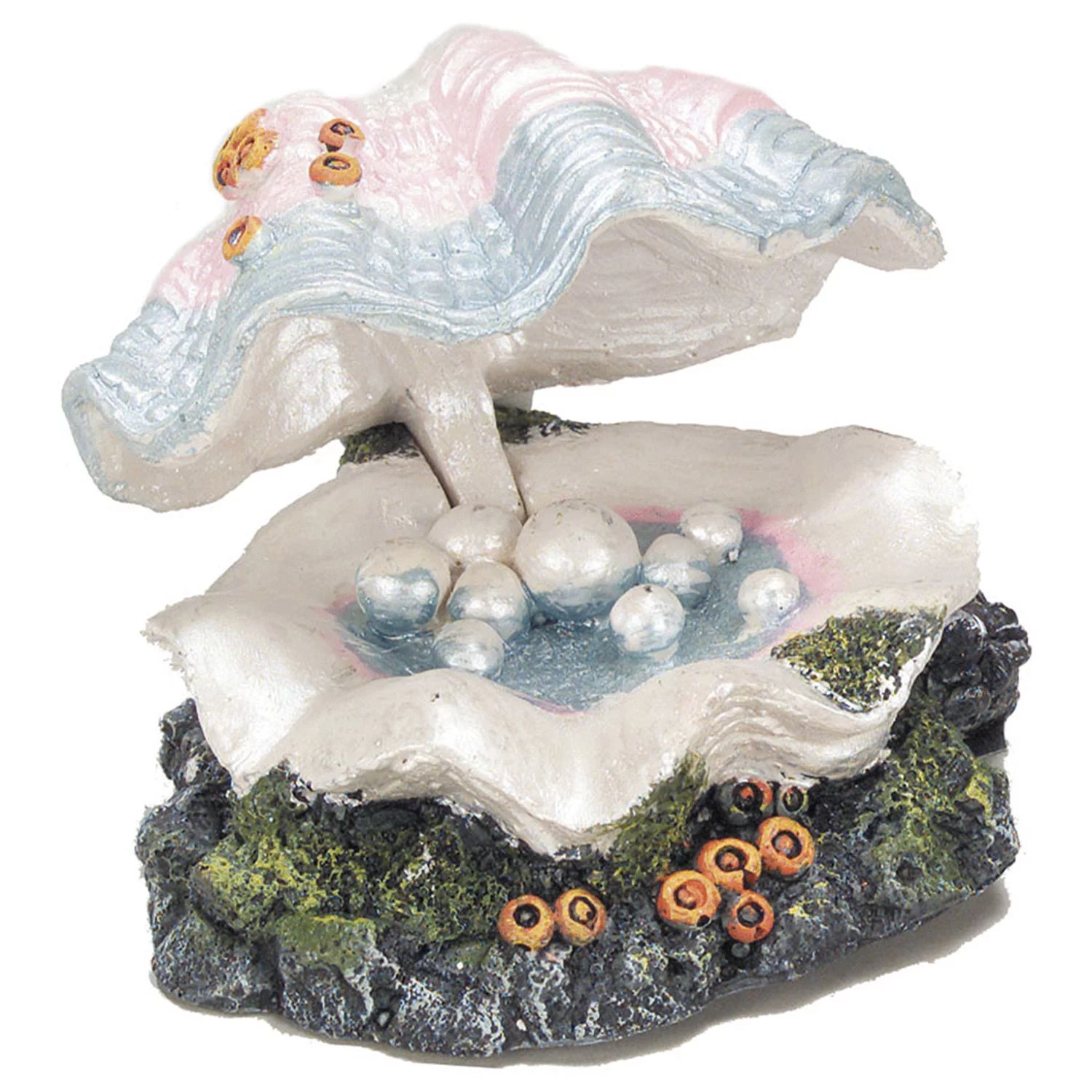 Natuurgetrouwe decoratie van een mossel met parels. Vervaardigd van polyrin (kunsthars). Door de ingebouwde uistromer wordt er een bewegingseffect gecreëerd dat er voor zorgt dat de bovenzijde open en dicht gaat. Hiervoor is een luchtpomp benodigd (luchtpomp niet inbegrepen).