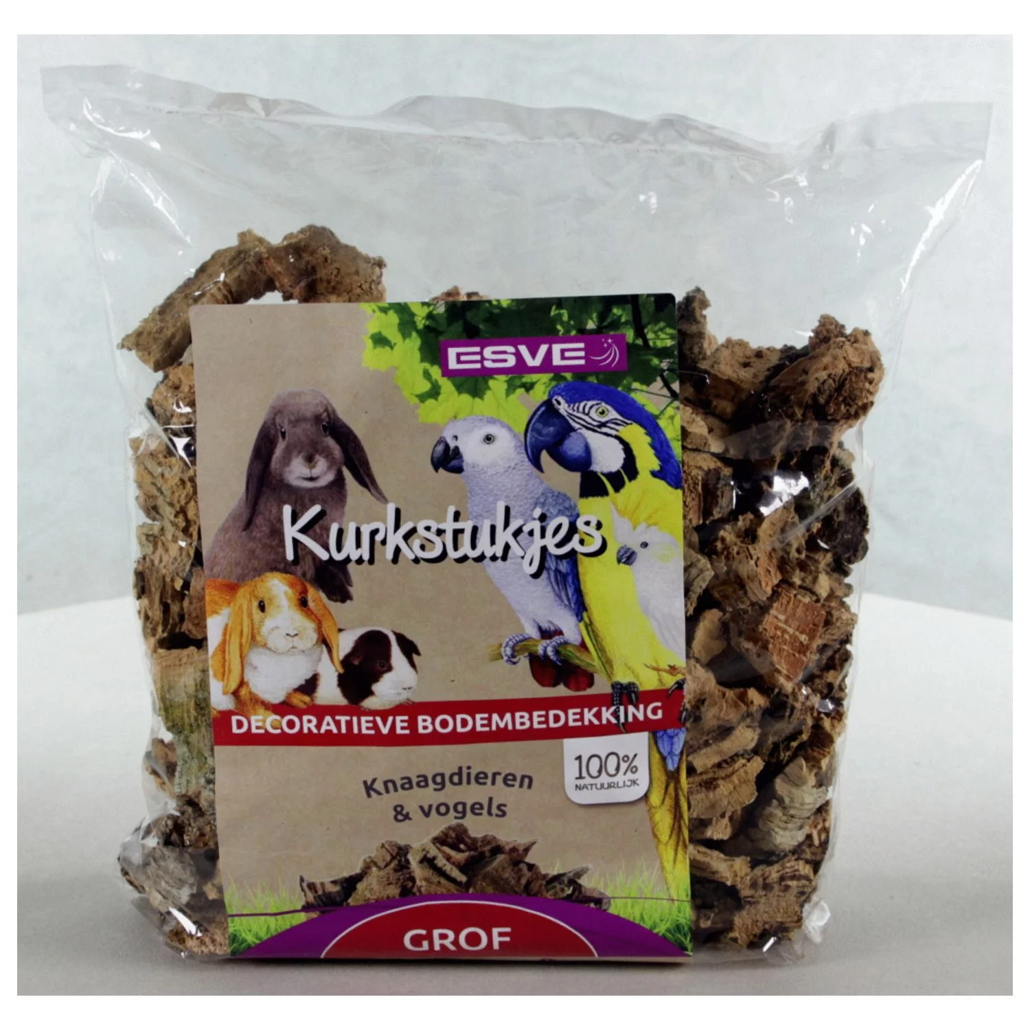 ESVE kurksnippers grof zijn bedoeld als natuurlijke toplaag over absorberende bodembedekking. Kurk is van nature een vochtafstotend materiaal. Kurk kan gebruikt worden als decoratieve en natuurlijk gedrag bevorderende bodemverrijking voor knaagdieren en vogels. Kurk is bedoeld om uw dier uit te dagen tot natuurlijkgedrag, daarom is het wenselijk om gebruik te maken van verschillende bodembedekkingen in 1 verblijf. Gebruik voor de plek waar jouw dier zijn ontlasting doet een absorberende bodembedekking. Zo gaan de kurkstukjes nog langer mee.