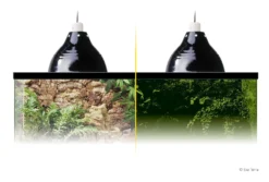 De Exo Terra Glow Light geeft de mogelijkheid overal waar nodig een licht/warmtebron te plaatsen. Van industriële kwaliteit, met aluminium reflector, warmtebestendige GU-10 fitting en klem met balhoofd. Het kan gemakkelijk aangeschakeld worden door de schakelaar, die op het extra lange snoer gemonteerd is. De binnenzijde van de reflector is gecoat met een hoogreflecterende lichtgevende coating, die nog lang nadat de lamp is uitgeschakeld het opgeslorpte licht blijft uitstralen. Dit laat de dagactieve reptielen en amfibieën toe zich in te graven en terug te trekken in hun schuilplaatsen zonder stress. Net als bij maneschijn laat het de nachtactieve reptielen en amfibieën toe te zien zonder hun nachtcyclus te verstoren. Het is tevens ideaal om je dieren tijdens de nacht te observeren, zonder het licht aan te schakelen, hetgeen stress en desoriëntatie kan veroorzaken. Deze polyvalente lamphouder kan gebruikt worden met een variëteit aan schroefdraadlampen: Daytime Heat Lamp, Intense Basking Spot, Daylight Basking Spot, Halogen Basking Spot, Repti Glo Compact 2.0, 5.0 & 10.0, Infrared Basking Spot, Solar Glo 125W, enz. De anders verloren lichtstralen worden gereflecteerd en de lichtenergie van overdag wordt opgeslorpt door de coating, langzaam weer afgegeven tijdens de nacht, hetgeen deze lichtkap energie efficiënter maakt dan conventionele lichtarmaturen. Een extra nachtverlichting is overbodig, tenzij die ook gebruikt wordt als warmtebron.