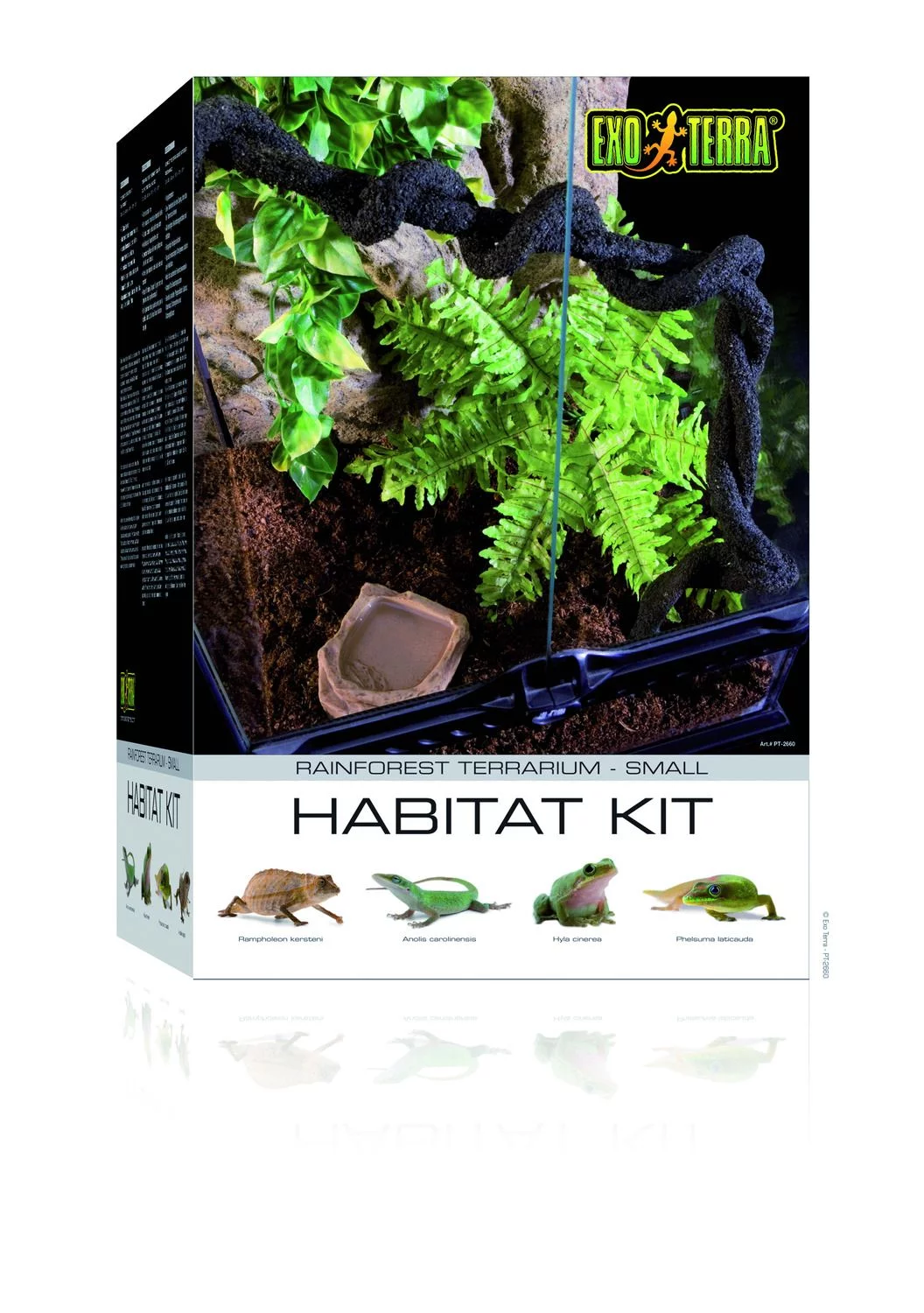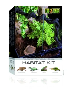Een Gebruiksaanwijzing ter referentie is ingesloten met nuttige informatie aangaande inrichting, decoratie en onderhoud van deze Exo Terra Rainforest Terrarium Kit.De Habitat Kit Small is ideaal voor: kleine slangensoorten, hagedissen en gekko’s zoals Anolis carolinensis, Anolis sagrei, Rhampholeon brevicaudatus, Holaspis guentheri, Takydromus sexlineatus,Phelsuma laticauda, Hemidactylus frenatus, Lygodactylus luteopicturatus, Mabuya macularia,Sceloporus variabilis, Brookesia superciliaris, Hyla cinerea en tal van andere soorten. Ook geschikt voor jonge dieren van grotere soorten als opkweekbakje. De set is exclusief lamp.