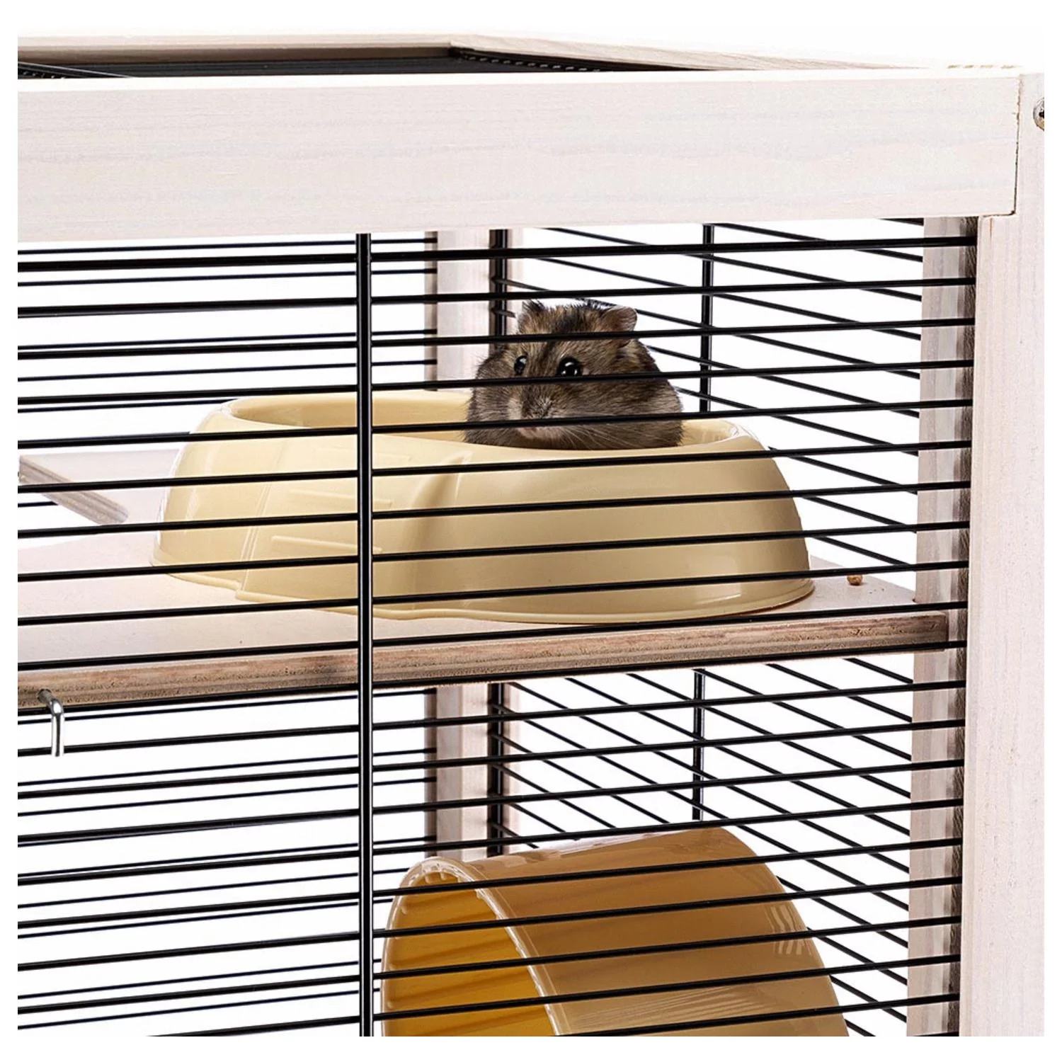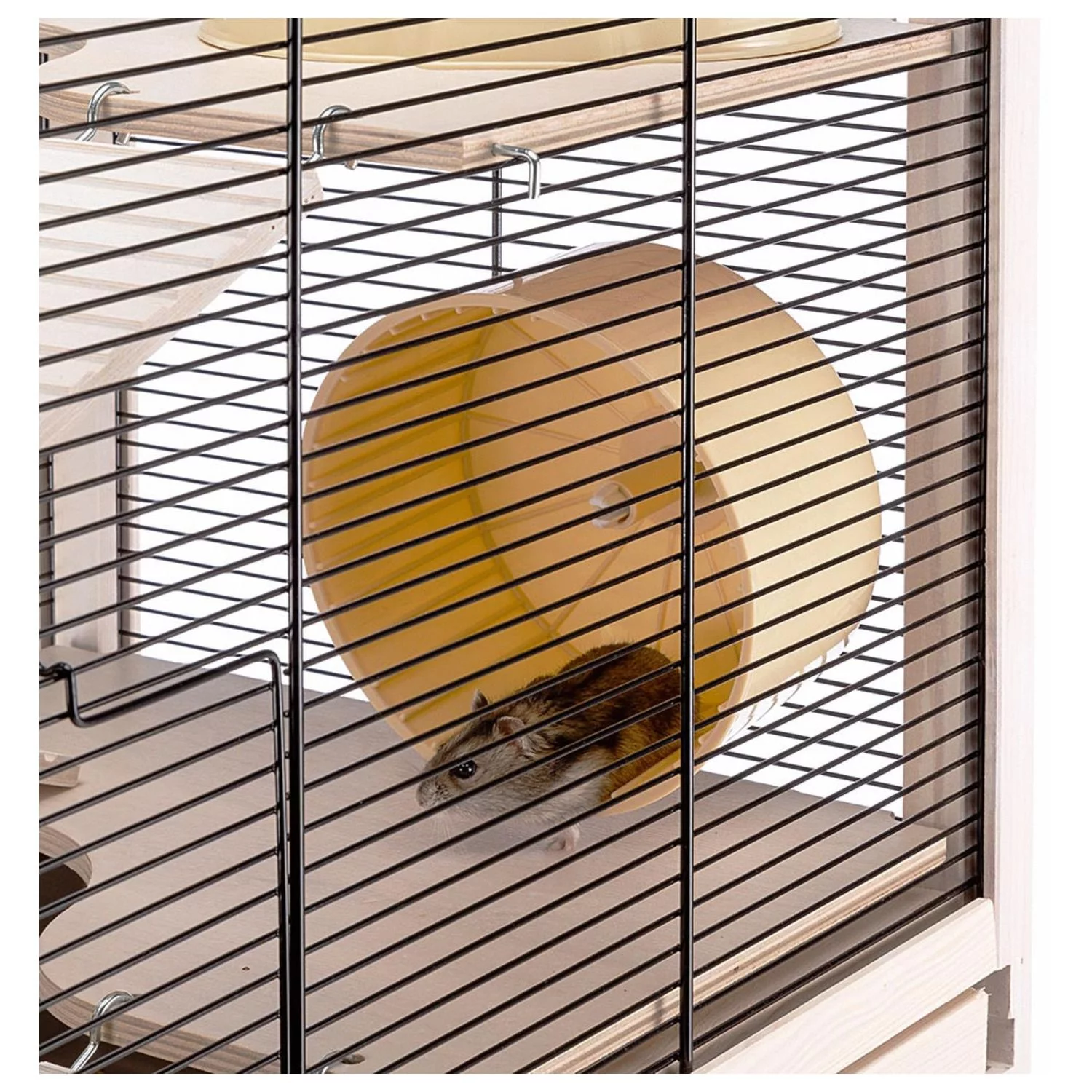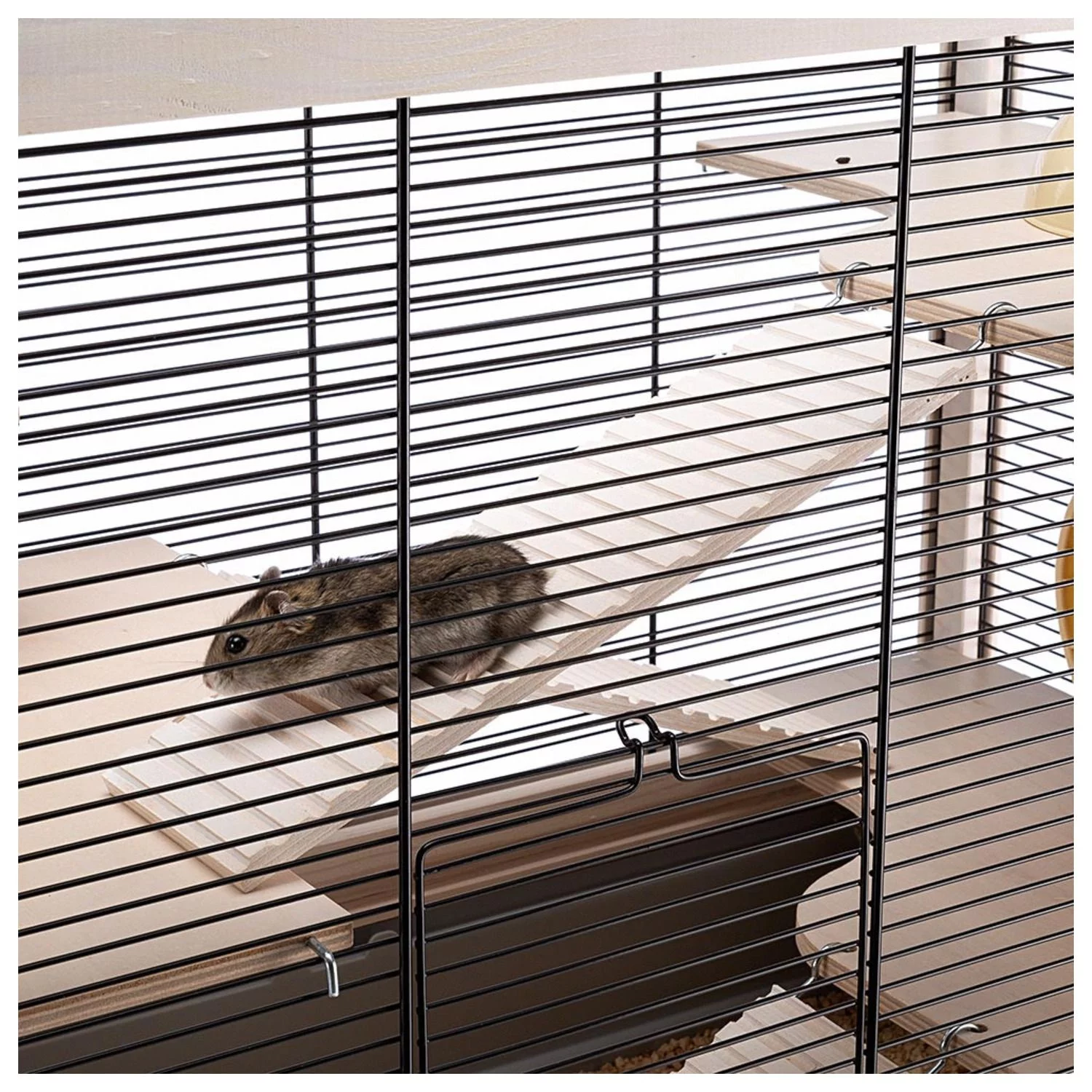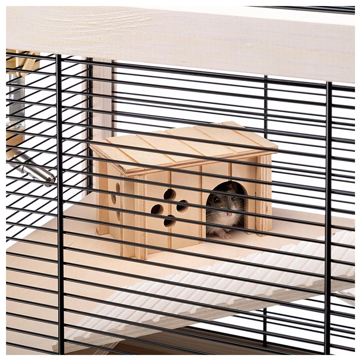 De Hamsterville is een mooie houten kooi voor je knaagdier. De kooi is praktisch en comfortabel en biedt veel ruimte door middel van de vier verschillende verdiepingen. Dankzij de verschillende plateaus kan je knager deze kooi op verschillende manieren verkennen en komt hij ook nog eens aan genoeg beweging toe. De plateaus zijn te bereiken met de bijgevoegde ladders, deze zijn allen bewerkt zodat ze waterdicht zijn en gemakkelijk schoon zijn te houden.