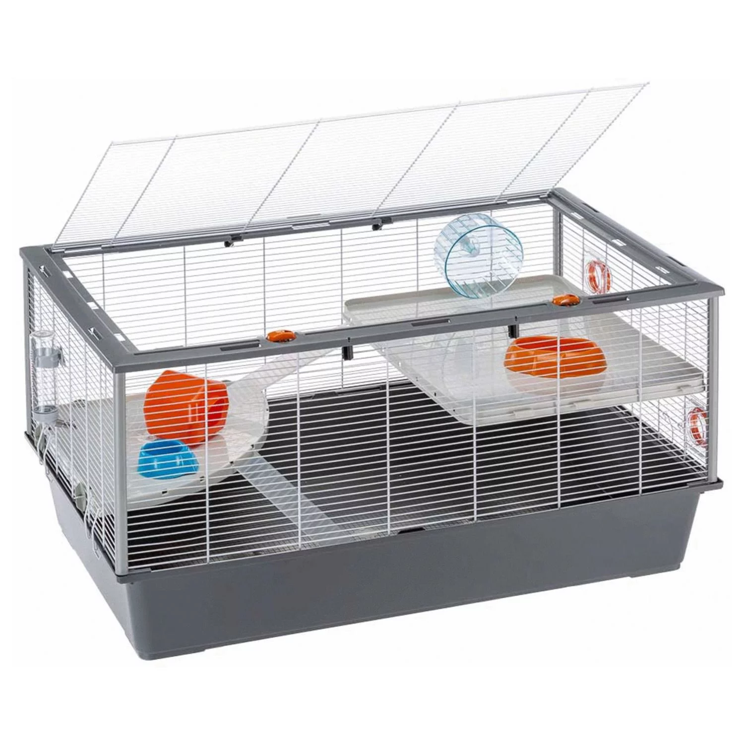 Deze kooi is modulair, wat wil zeggen dat je de kooi kunt combineren met andere kooien, buizen of accessoires van Ferplast om de leefruimte van je hamster te vergroten.