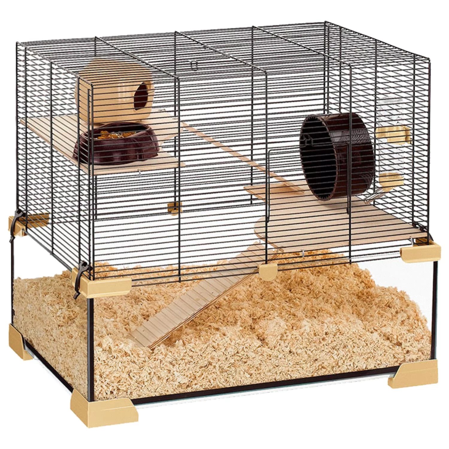 Deze kooi is voorzien van een glazen onderbak. Deze onderbak is te vullen met een dikke laag bodembedekking. Dit stimuleert het graven en zo kan je als toeschouwer zien hoe je hamster zijn gangen aan het graven is. Ook bevat de kooi houten planken (behandeld met een vloeistofbestendige lak zodat nattigheid er niet in trekt) waarmee je hamster of muis door de kooi kan navigeren. Deze plateaus creëren een groter leefoppervlakte en worden verbonden met de ladders. De bovenkant van de kooi is gemaakt van robuuste zwarte tralies met een kleine afstand tussen de tralies zodat je huisdier hier niet doorheen kan kruipen.