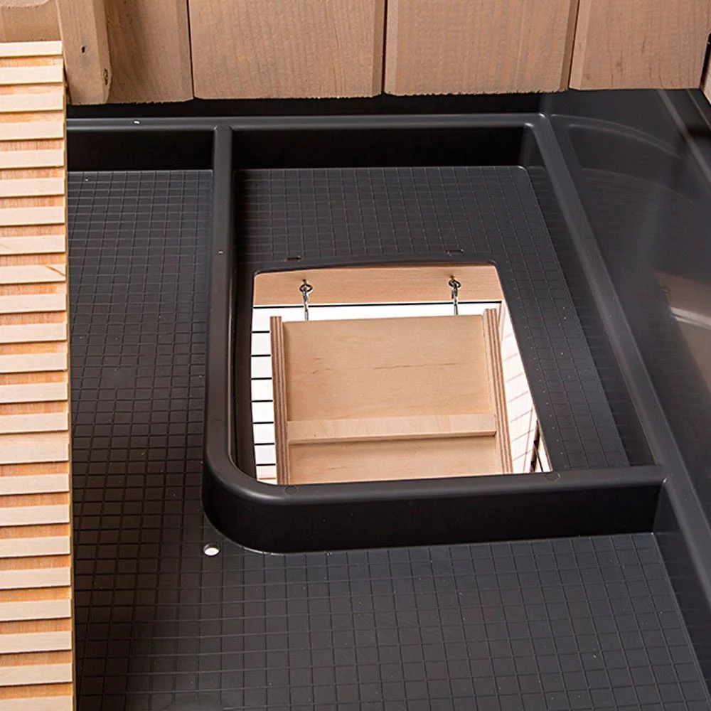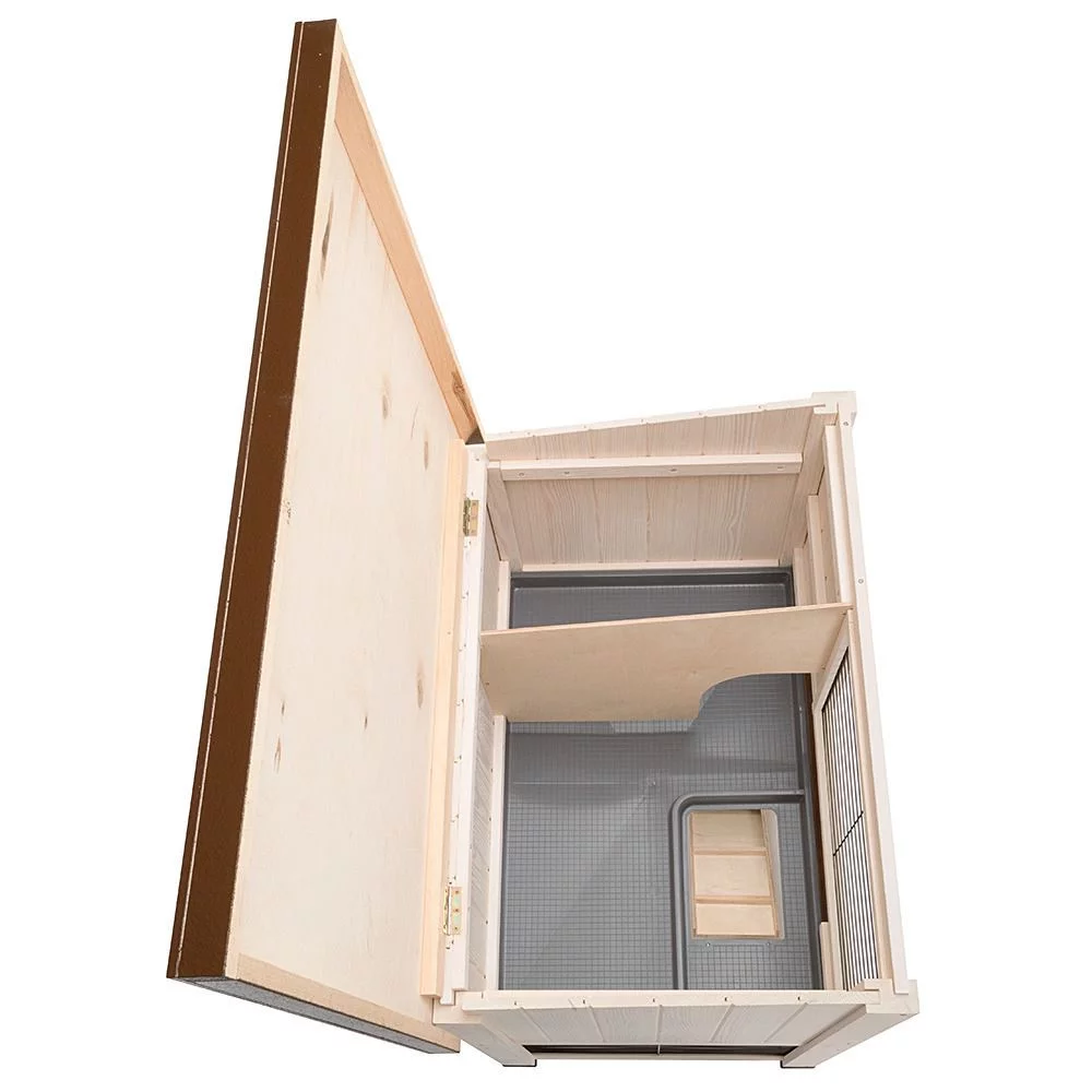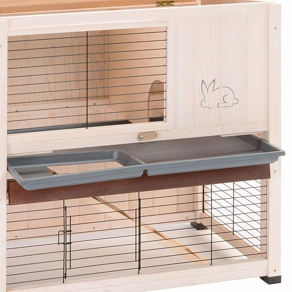 De Charlie heeft een praktisch uitneembare schuiflade die je gemakkelijk en snel kunt schoonmaken. Met behulp van een houten ladder kan je konijn bij de bovenste verdieping komen.