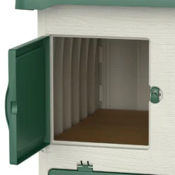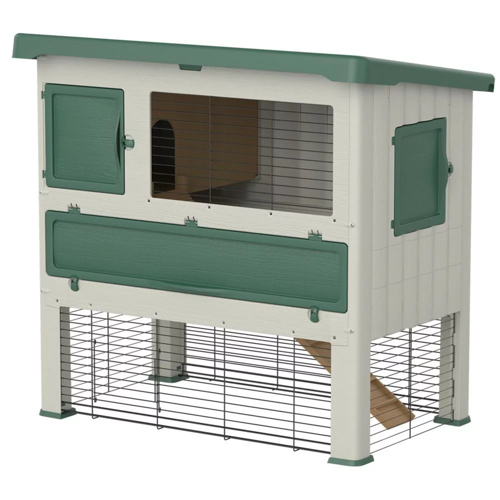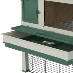 De Grand Lodge 120 heeft een dak dat volledig open kan en heeft een praktisch uitneembare schuiflade die je gemakkelijk en snel kunt schoonmaken. Dit konijnenhok wordt compleet geleverd inclusief accessoires zoals een voerbakje, drinkflesje en een houten ladder om bij de bovenste verdieping te komen.