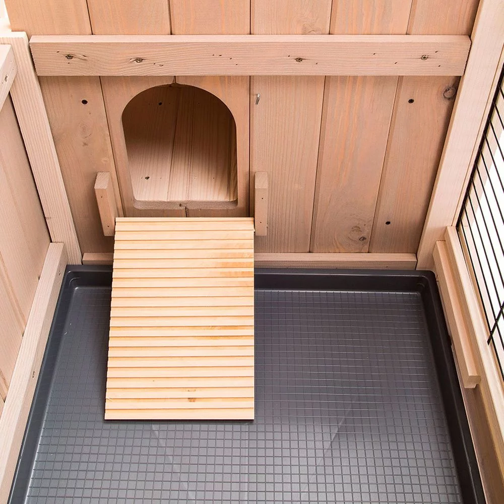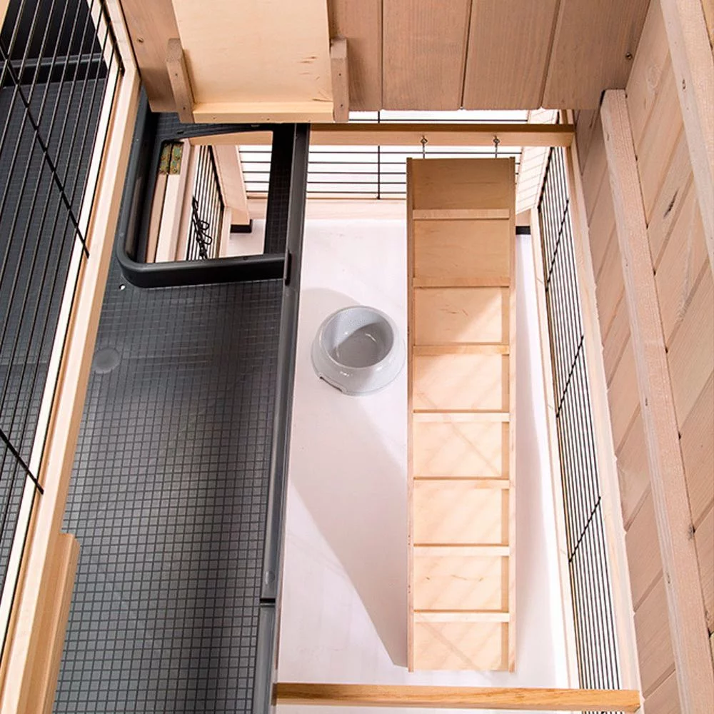 De Ranch Plus heeft een dak dat volledig open kan en heeft een praktisch uitneembare schuiflade die je gemakkelijk en snel kunt schoonmaken. Dit konijnenhok wordt compleet geleverd inclusief accessoires zoals een voerbakje, drinkflesje, hooiruif en een houten ladder om bij de bovenste verdieping te komen.