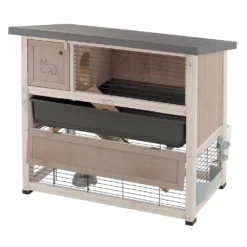 Het nachthok is gemaakt van hout en heeft een handig te openen zijdeur zodat je makkelijk bij het verblijf kan komen en het beschikt over een efficiënt en veilig sluitsysteem. De onderste helft van het hok dient als een ren waarin je konijnen vrij kunnen spelen, eten en drinken. Via het schuifdeurtje kunnen je konijnen uit het verblijf en kunnen ze vrij rondlopen in je tuin of huis.