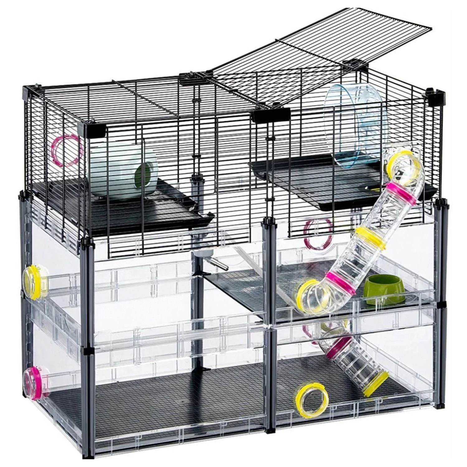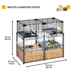 Het Multipla hamster crystal-model is uitgerust met een huisje, eetbakje, drinkfles, wiel, ladders om toegang te krijgen tot de verschillende verdiepingen en buizen om uit te breiden of en buizenstelsel te creëren. Het ontwerp is essentieel en functioneel: de transparante kunststof wanden zorgen voor een volledig zicht op jouw knager binnenin. De hoge basis is ruim en kan worden gevuld met zaagsel waarin hamsters en muizen graag graven en zich verstoppen.
