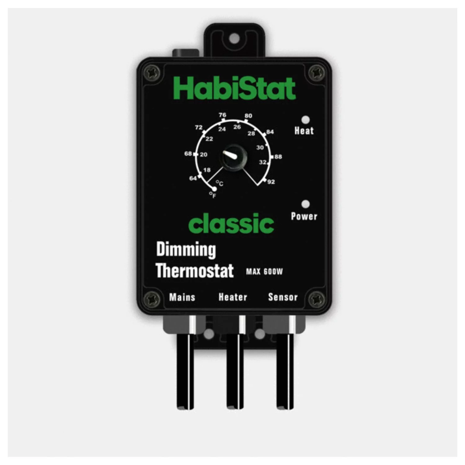 De Dimming Thermostaat is speciaal ontworpen voor het regelen van lampen, maar hij kan ook gebruikt worden op bijna elk type verwarming. In tegenstelling tot andere HabiStat thermostaten vereist de Dimming Stat wel een minimale belasting van 40 Watt, maar hij heeft een maximale capaciteit van 600 Watt bij 230 Volt. Dit is de enige thermostaat die wij aanbevelen voor gebruik met gloeilampen. De thermostaat levert een continue variabele stroom- of spanningstoevoer in plaats van een stroompuls aan de verwarming. normale en speciale “high range” versie voor hogere temperaturen.