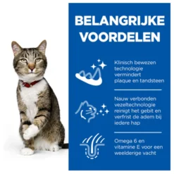 Een goede mondhygiëne is van groot belang voor je kat. Als je niks doet aan de verzorging van het gebit, kan er tandplak en tandsteen vormen wat op den duur pijnlijk en zelfs gevaarlijk kan zijn voor je kat. Hill’s Science Plan Oral Care zijn droge kattenbrokjes die een klinisch bewezen technologie bevatten om de opbouw van tandplak en -steen te verminderen.
