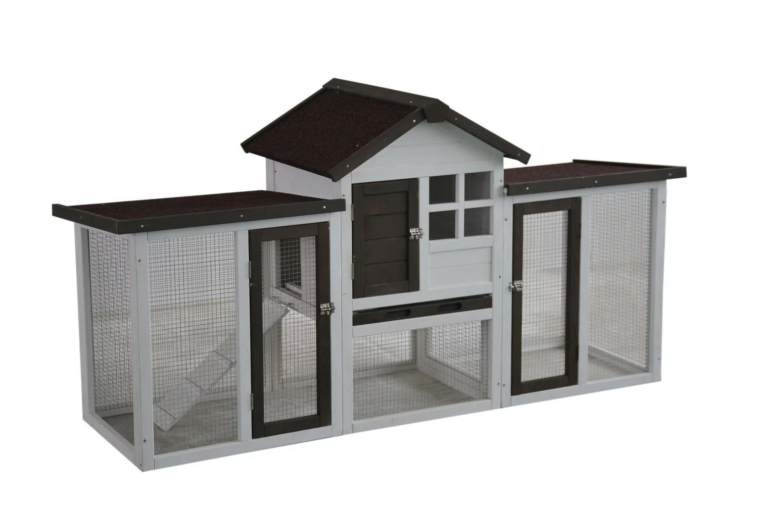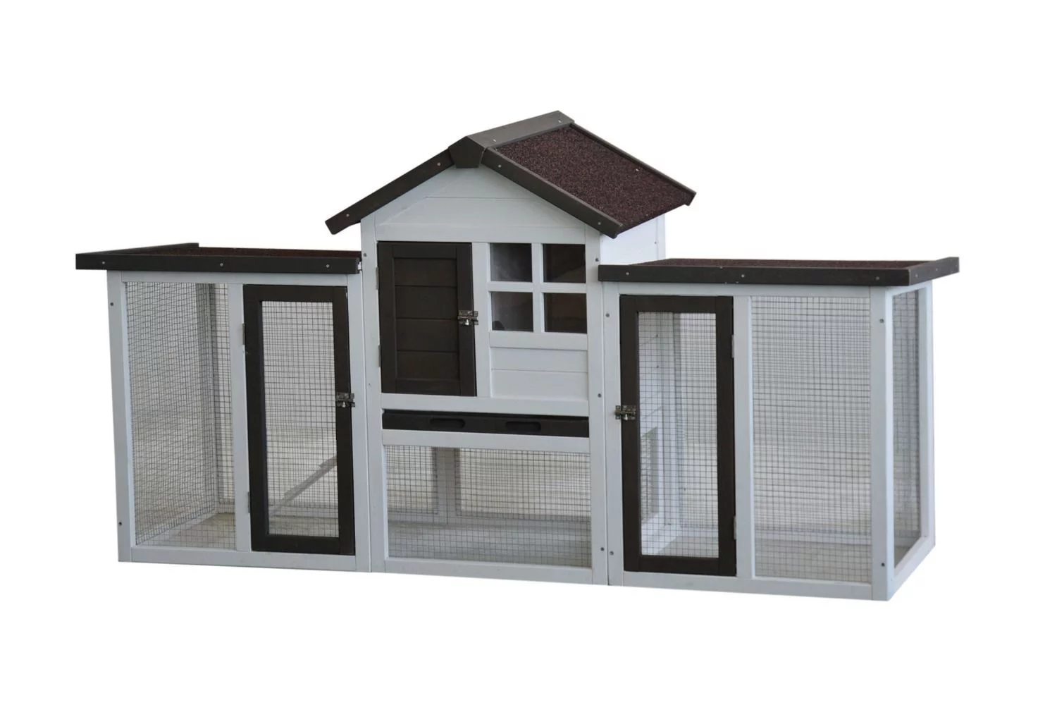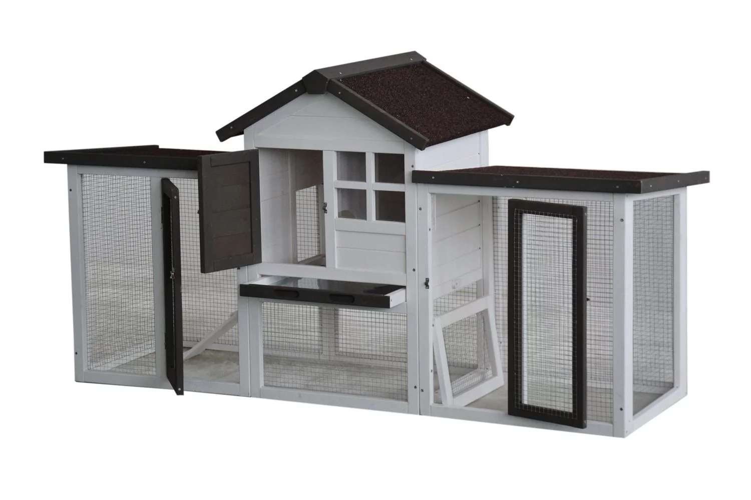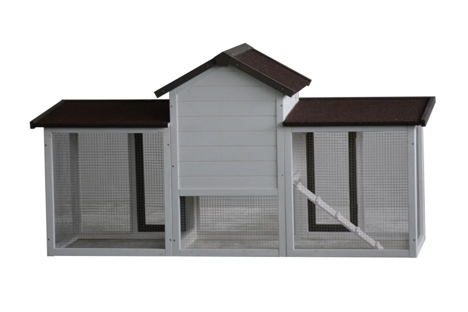 Konijnenhok Fenna is een hok met veel bewegingsruimte. De ren loopt namelijk onder het nachtverblijf door en het hok is gemakkelijk te betreden via de diverse deuren. Zo kun je eenvoudig het hok versschonen of jouw dier verzorgen. Konijnenhok Fenna is volledig overdekt en onder het nachthok zit een schuiflade, die je eenvoudig er uit kan halen voor een schoonmaakbeurt. Het hok is wit, met bruine daken en accenten en de afmeting is 180x62x93 cm. Wil je nog meer bewegingsruimte bieden aan je konijnen, dan is een konijnenren eenvoudig te bevestigen aan het hok.