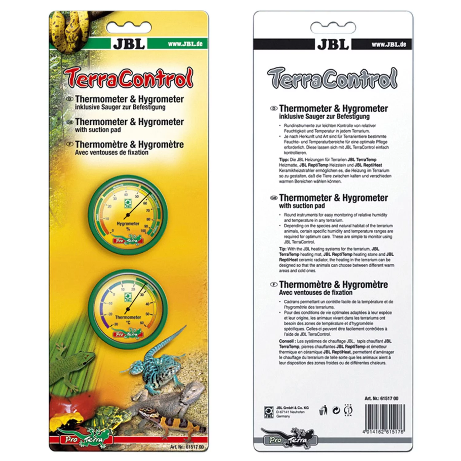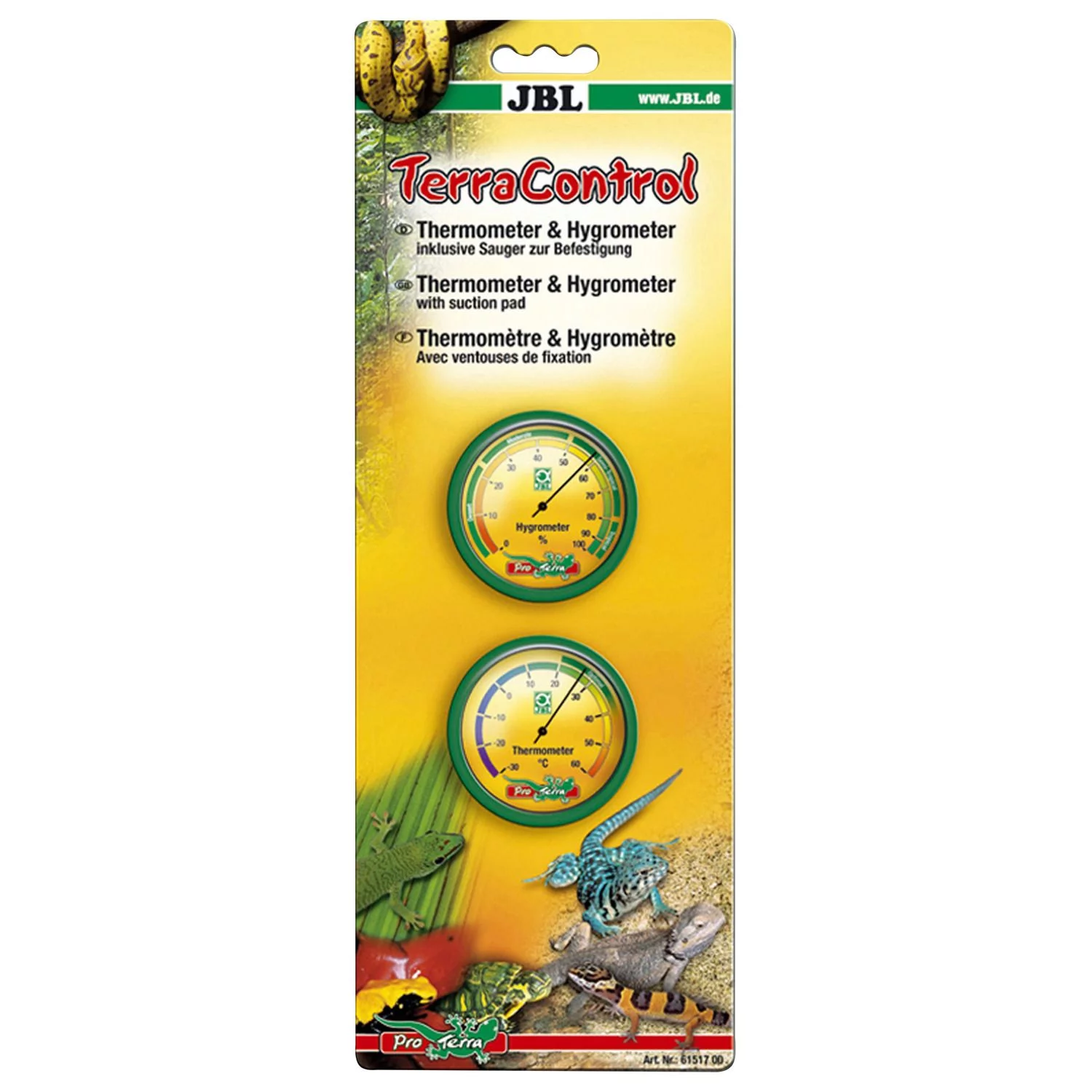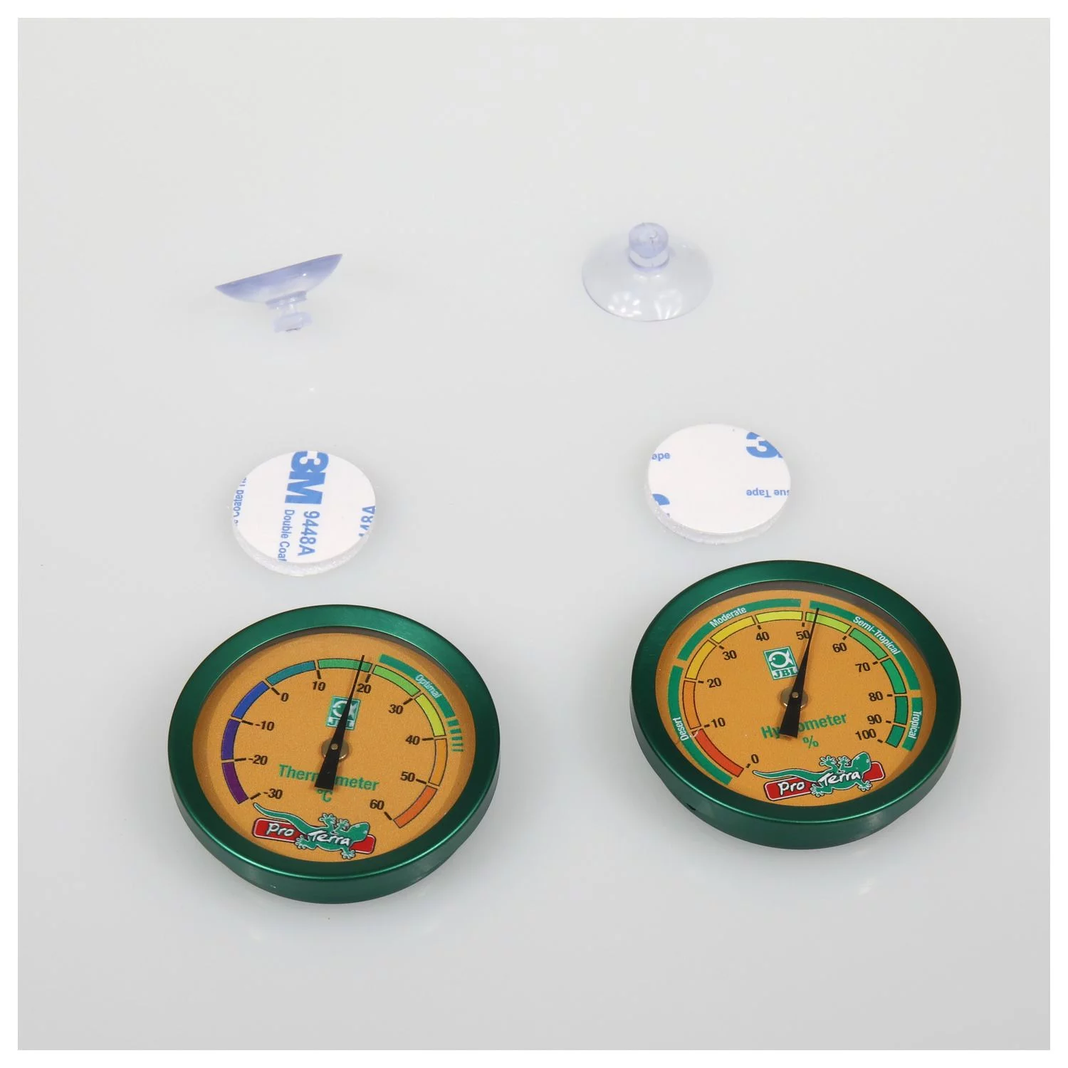 Thermo- en hygrometer incl. zuignap. Thermometer voor een eenvoudige controle van de relatieve vochtigheid en temperatuur in het terrarium. Temperatuurrange: -30 tot +60 graden. Luchtvochtigheidswaarde: 0 tot 100 % in stappen van 10 %. Range van 20 tot 35 is met “optimaal” gemarkeerd. Inhoud: 1 thermo- en 1 hygrometer incl. zuignap & klitteband