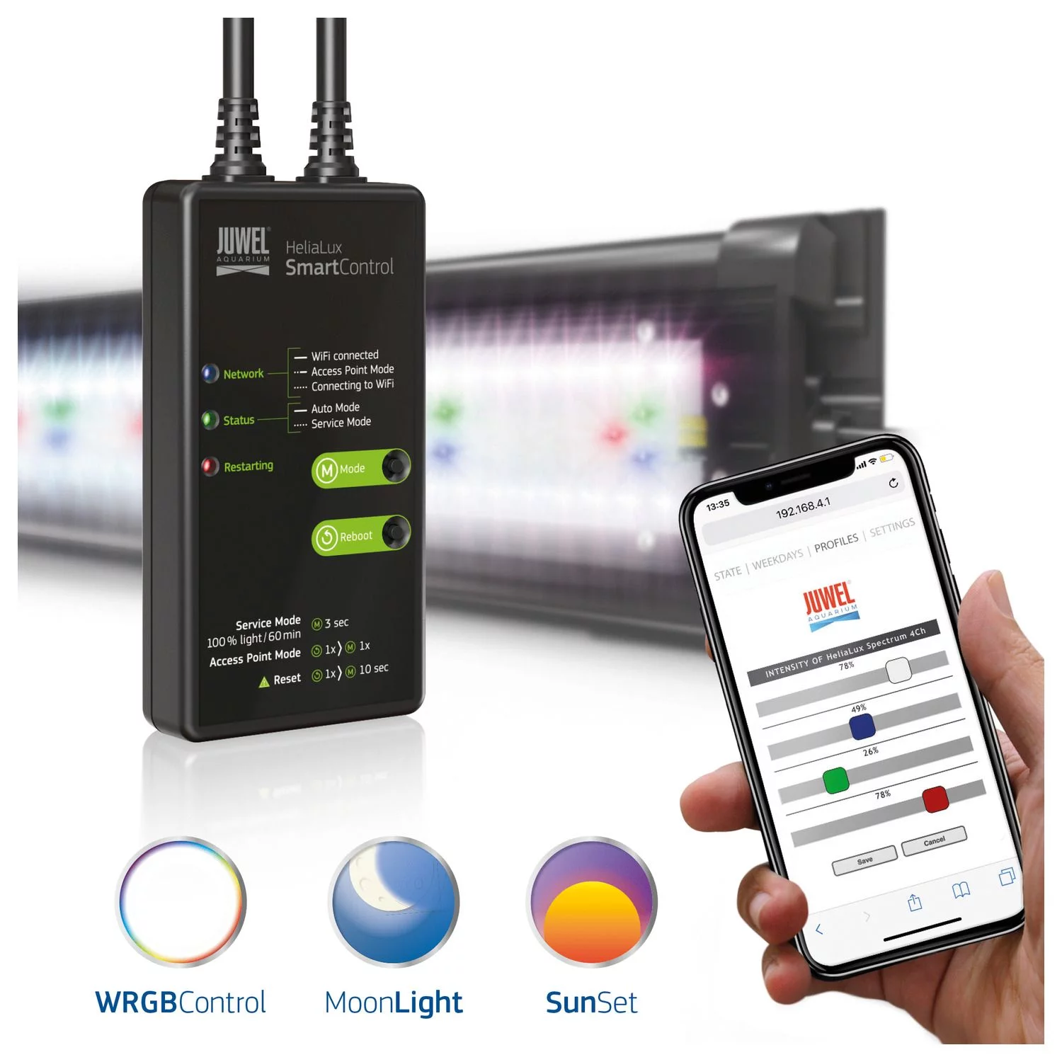 Met de controller kun je de lichtcondities in het aquarium op je eigen behoeftes aanpassen. Behalve zonsop- en ondergang kun je heel handig tot wel 16 verlichtingsfases per dag individueel programmeren. Leg snel en simpel afhankelijk van het moment van de dag de sfeer in jouw aquarium vast en zorg met dit kleureffect voor een unieke sfeer in de onderwaterwereld.