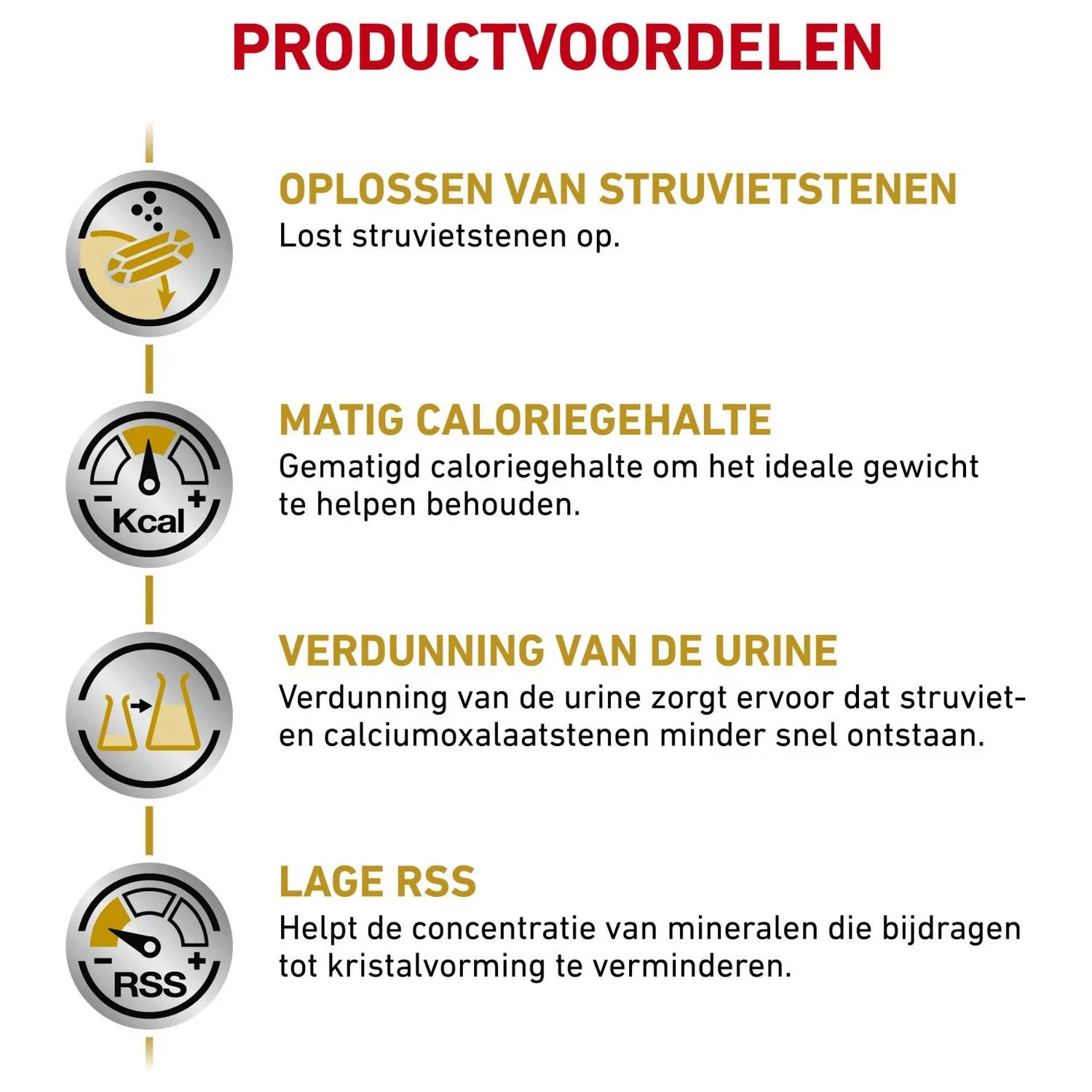 - Ondersteuning bij het voorkomen van de vorming van struviet- en calciumoxalaatstenen