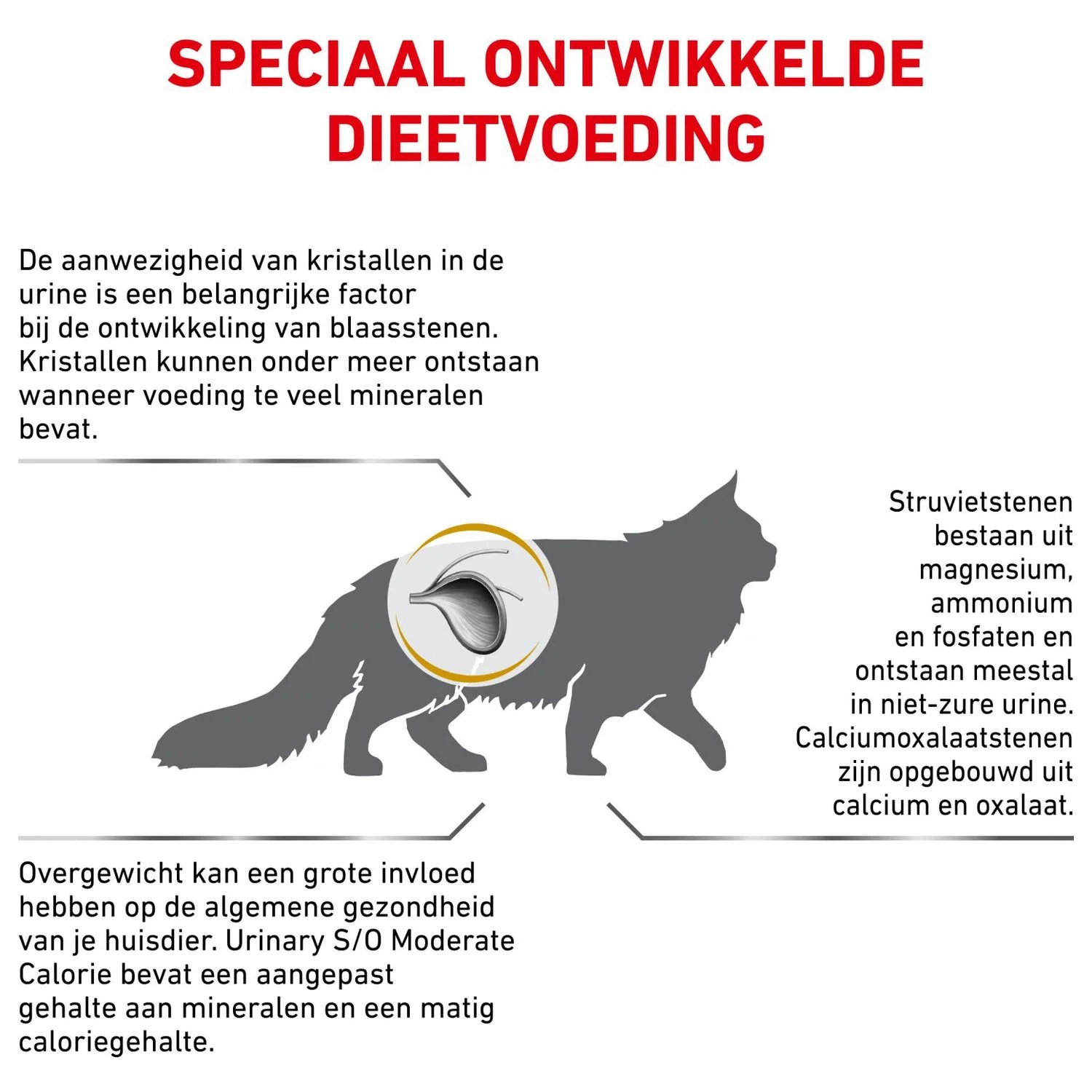 Urinary S/O Moderate Calorie kan worden ingezet voor het voorkomen en het oplossen van urinekristallen in de lagere urinewegen. Door de unieke samenstelling kunnen struvietstenen worden opgelost en kunnen zowel struviet- als calciumoxalaatstenen worden voorkomen. Het licht verhoogde natriumgehalte zorgt er daarbij voor dat de vochtopname wordt verhoogd. Hierdoor zal het urinevolume toenemen waardoor de concentratie aan kristalvormende deeltjes wordt beperkt. Deze voeding kan in combinatie met antibiotica ook worden gebruikt bij een blaasontsteking, overleg dit eerst met je dierenarts.
