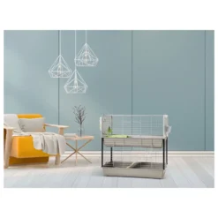 De onderste verdieping heeft een grote deur aan de voorzijde en de bovenste verdieping heeft zowel aan de voorkant als aan de bovenkant een grote deur. Daarnaast is de kooi inklapbaar, waardoor hij gemakkelijk kan worden opgeborgen als hij niet wordt gebruikt en gemakkelijk in elkaar kan worden gezet.