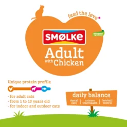 Een complete kattenvoeding met natuurlijke ingrediënten wat elke dag weer zorgt voor een blije en tevreden kat, dat is Adult Chicken and Rice kattenvoeding van Smølke. Deze brokjes bevatten alles wat je kat nodig heeft om iedere dag in balans te zijn. Het voer is geschikt voor volwassen katten vanaf 1 jaar tot 8 jaar oud.