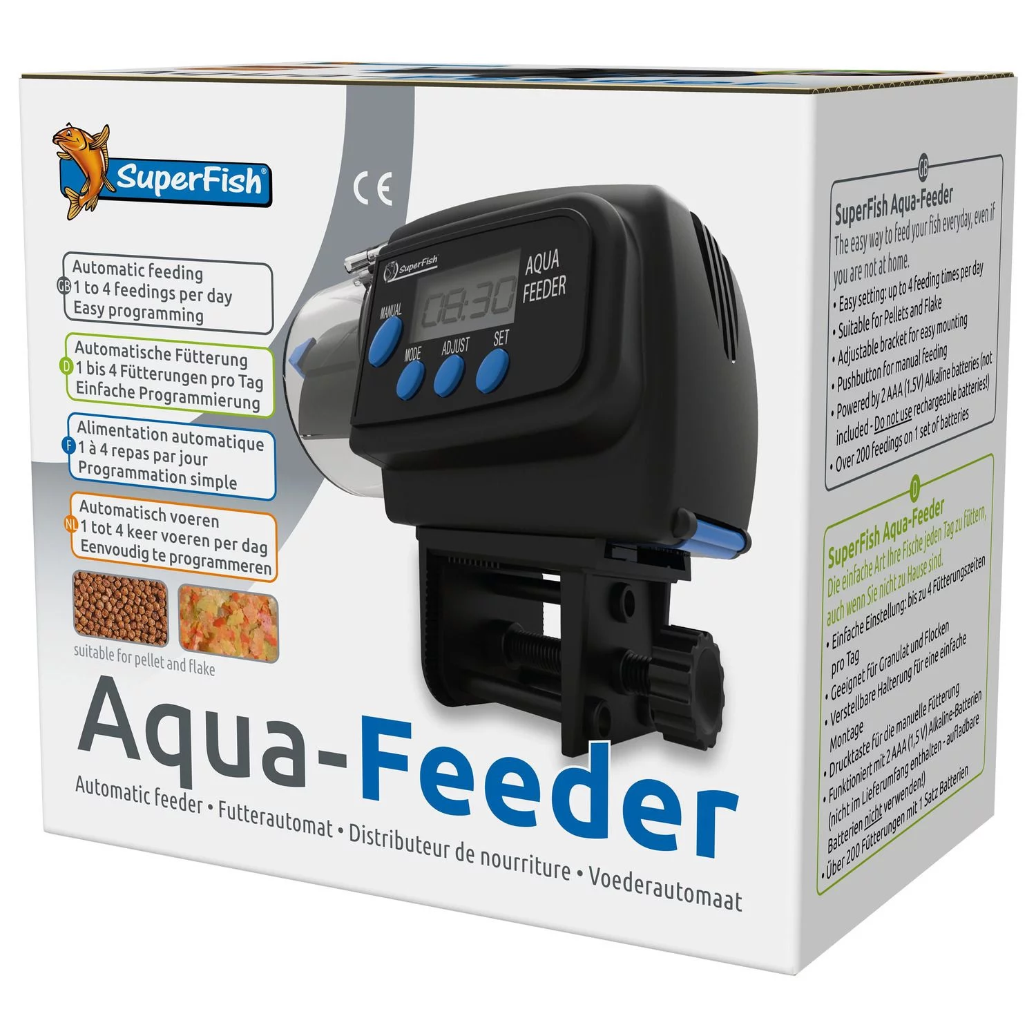 De eenvoudige manier om je vissen iedere dag te voeren, zelfs als je niet thuis bent. Hiermee zorg je ervoor dat je vissen dagelijks aan hun juiste voedingsbehoefte komen en geef je de vissen nooit te veel / te weinig. Programmeerbaar tot 4 voertijden per dag. Meer dan 200 keer voeren op 1 set batterijen (batterijen niet inbegrepen).