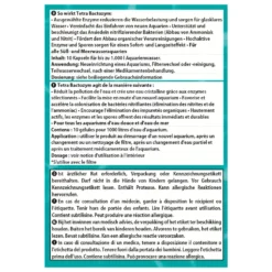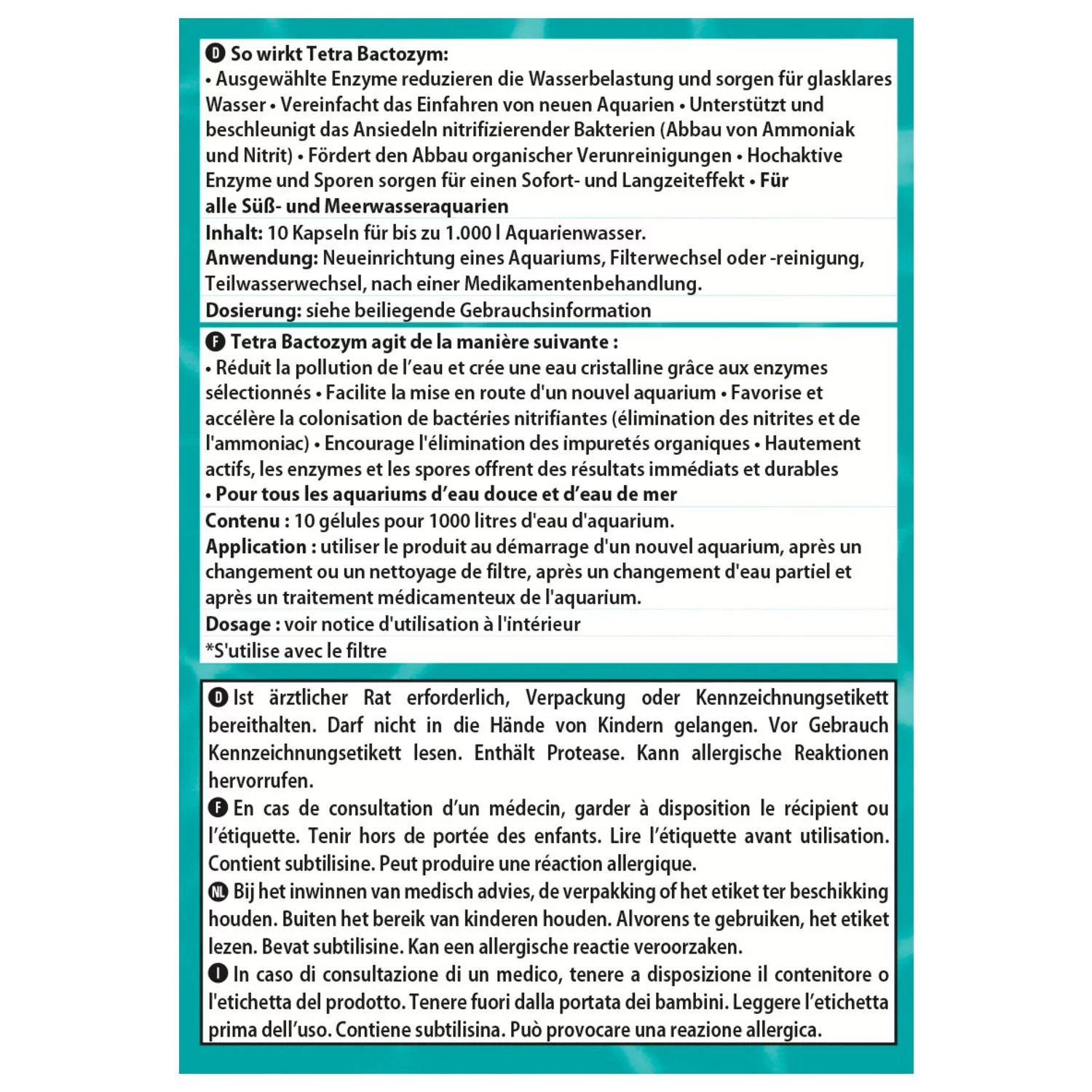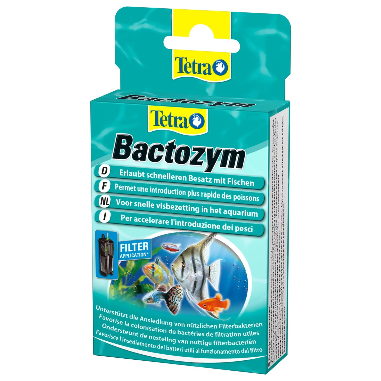 De Bactozym van Tetra draagt zorgt voor een biologische activiteit in het aquarium. Natuurlijk organische colloïden vormen een onzichtbaar laagje op het filtermateriaal en alle andere oppervlakken. Hierdoor stimuleren ze de nesteling van nuttige filterbacteriën. Daardoor kunnen de eerste vissen al na 24 uur in het nieuwe aquarium gezet worden. Het water verversen en het filter vervangen is mogelijk zonder ernstig verlies van de biologische activiteit. De geselecteerde enzymen zorgen voor minder waterverontreiniging en helder water. De door geneesmiddelen verzwakte of beschadigde micro-organismen worden weer gerevitaliseerd. Deze verbeterde formule met zeer actieve enzymen en sporen werkt direct en langdurig. Geschikt voor alle zoet- en zeewateraquaria.