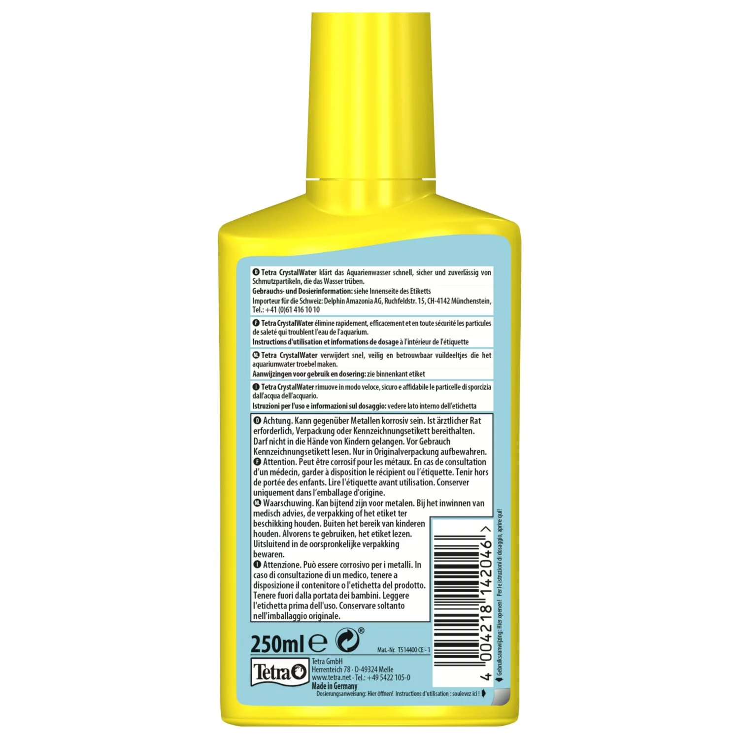 Zorgt voor kristalhelder aquarium water met de Crystalwater van Tetra. Deze vloeibare substantie verwijdert vertroebeling als gevolg van vuildeeltjes binnen enkele uren uit het aquariumwater. De eerste effecten zijn al na twee tot drie uur zichtbaar! De zorgvuldig geselecteerde mineralen verwijderen op milde wijze allerlei vuildeeltjes. Binnen zes tot twaalf uur heeft je aquarium kristalhelder water. De Crystalwater is geschikt voor alle zoetwateraquaria maar niet geschikt voor aquaria met ongewervelde dieren zoals slakken, garnalen en andere schaaldieren.