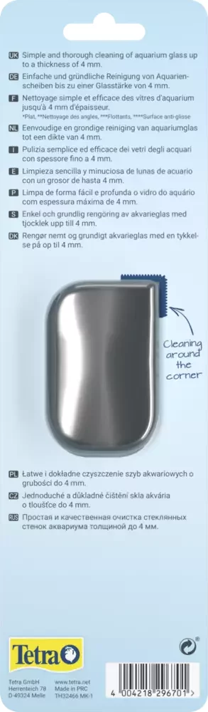 Een aquarium is een blikvanger in elke ruimte, maar met groene of bruine vlekken op het glas kunt u niet meer genieten van het leven in het aquarium. De Tetra Magnet Cleaner Flat S garandeert een perfect zicht op de vissen en het onderwaterlandschap. De vorm is perfect voor recht aquariumglas. Met de speciale reinigingshoek zijn de vaak moeilijk bereikbare hoeken van het aquarium eenvoudig te reinigen. Het antislipoppervlak biedt een goede grip bij het reinigen en door de ergonomische vorm ligt de magnetische reiniger prettig in de hand. Het deel in het water blijft drijven en voorkomt zo natte handen en krassen van steentjes van de bodem die tussen het glas en de magneet komen te zitten als de twee delen losraken. De Tetra Magnet Cleaner Flat S is geschikt voor een glasdikte tot 4 mm en voor zoet- en zeewateraquaria.