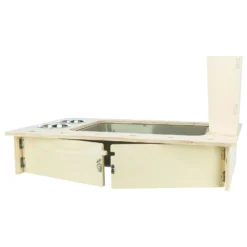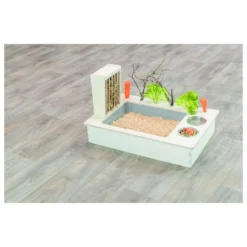 Het Trixie voederstation biedt veel verschillende uitdagingen. In het midden zit een kunststof bak die gebruikt kan worden als toilet of graafbak. Deze is eenvoudig eruit te schuiven, waarna deze schoon gemaakt kan worden. In de rand zitten twee RVS voer-/waterbakken, een hooiruif, extra openingen voor takjes, groenten of fruit. Jouw dieren kunnen dus aan alle kanten iets vinden om te doen en zullen hier dan ook graag komen. Wist je dat konijnen graag eten tijdens het toiletbezoek? Dat kan op deze plek dus als geen ander. Het Trixie voederstation heeft een afmeting van 70x41x47 cm en is gemaakt van onbehandeld hout.