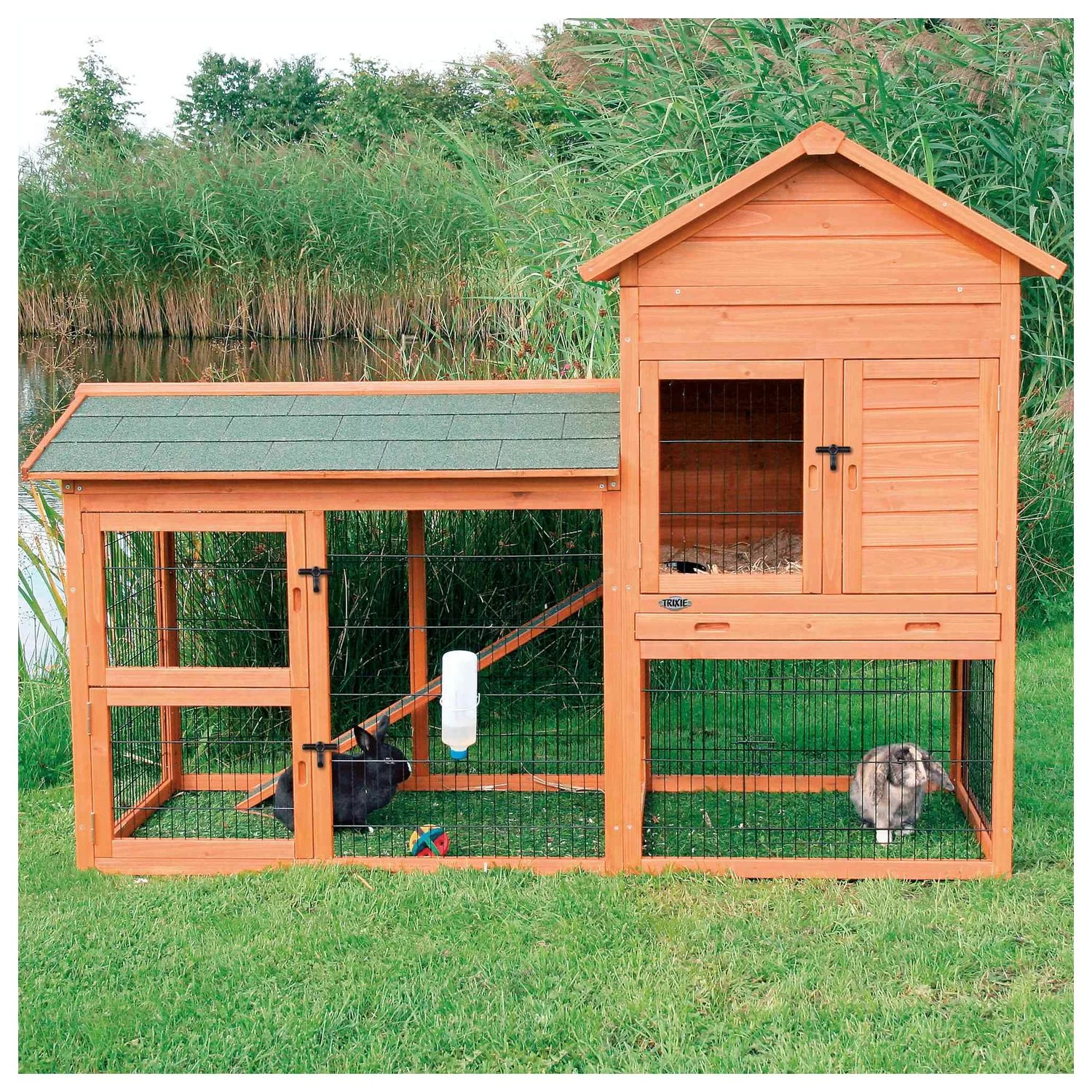Trixie Nature konijnenhok Pieter is gemaakt van gebeitst grenenhout. Wij raden voor onderhoud aan om het hok jaarlijks te beitsen. De afmeting van dit buitenhok bedraagt 199x93x146 cm
