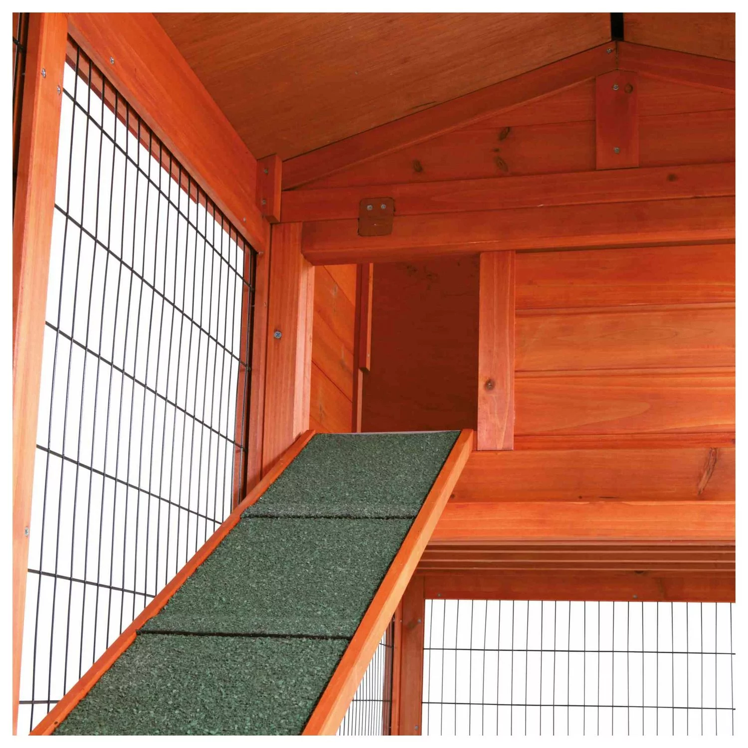 Het nachthok op de tweede verdieping is bereikbaar met een trapje, heeft een dichte deur voor warmte en veiligheid en een traliedeur voor goede bereikbaarheid. Een extra opbergruimte onder het dak geeft de mogelijkheid om spullen veilig en droog te bewaren. Mede omdat er een waterdicht dak op zit, gemaakt van asfaltpapier.