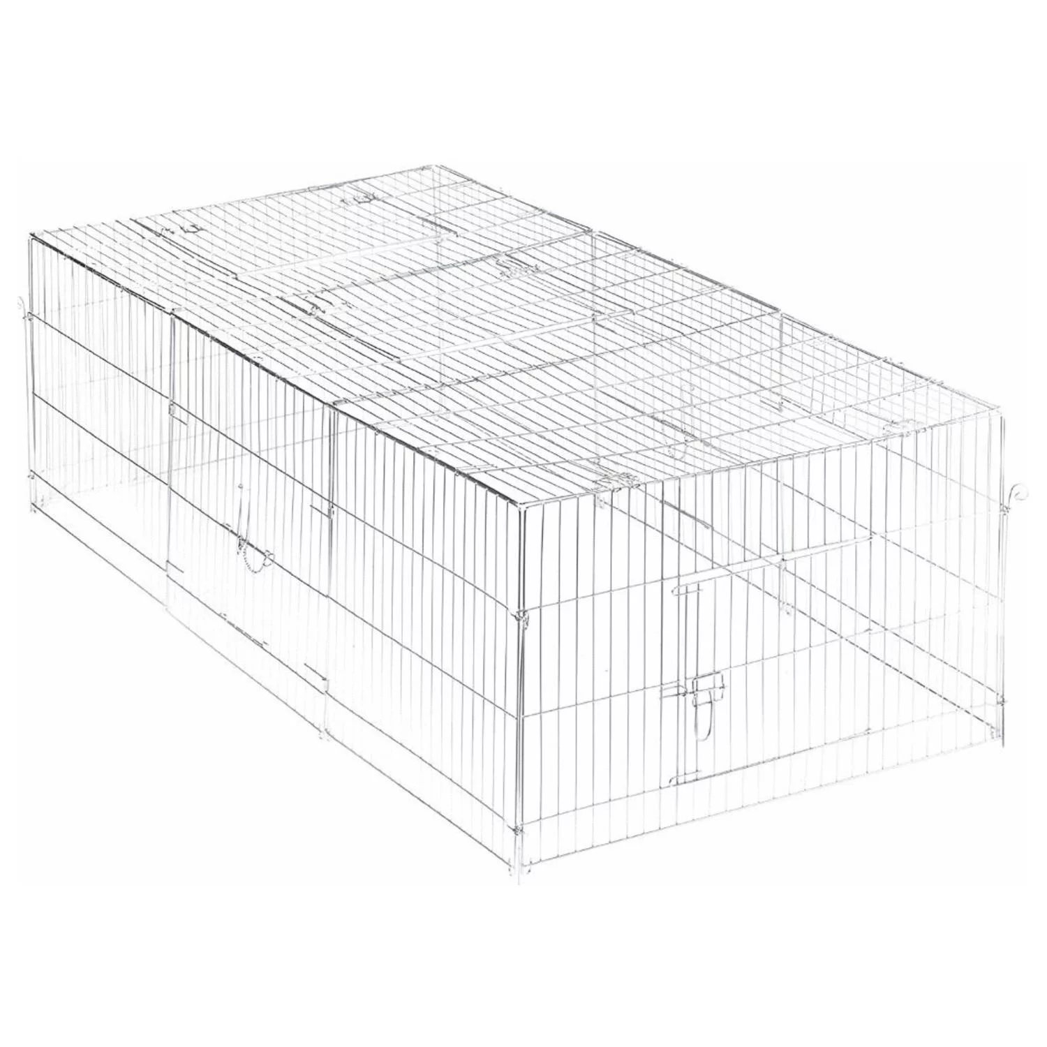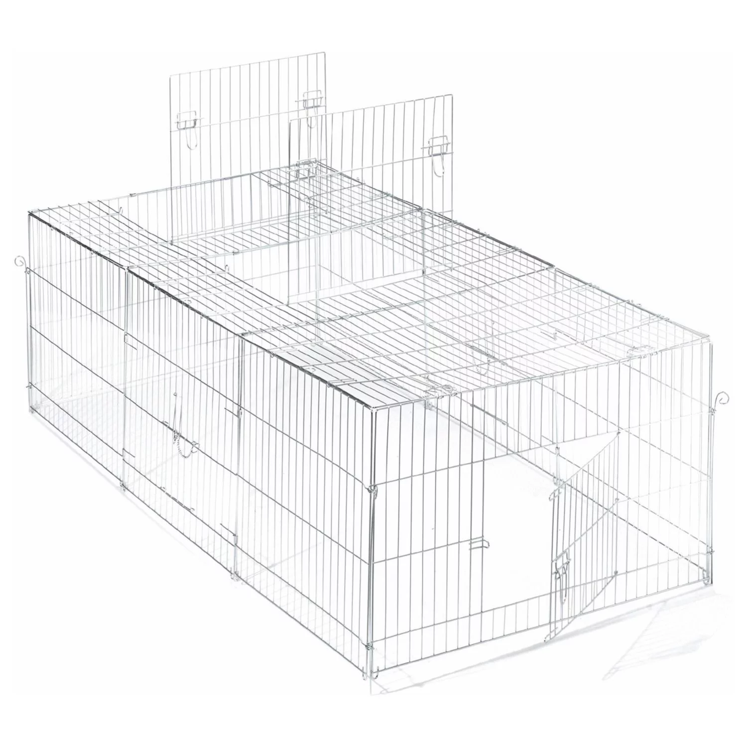 Het hok is gemakkelijk toegankelijk dankzij de grote deur in het dak, een grote zijdeur en twee kleine valdeuren in de zijpanelen. De valdeuren kunnen ook worden gebruikt om de ren aan het konijnenhok te koppelen.
