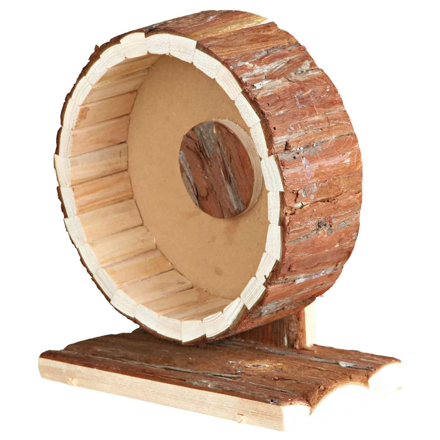 Het Trixie Natural living loopwiel voor kleine knaagdieren is gemaakt van schorshout, wat een natuurlijke uitstraling geeft. Door e kogellagers loopt hij lekker soepel en hoor je hem bijna niet. Het wiel heeft een gesloten loopgedeelte voor goede en door de afgeronde kanten is het risico op verwondingen aanzienlijk klein. De veilige standaard en gesloten achterwand voorkomen dat het dier klem kan komen te zitten Wij hechten veel waarde aan de gezondheid van jouw dier. Vandaar dat onze Natural Living producten uit naaldhoutsoorten zonder harskanalen bestaan. Hars is giftig voor dieren. De door ons gebruikte houtsoorten produceren geen hars en worden bovendien langdurig gedroogd. De lijm die wij gebruiken is eveneens niet giftig voor dieren en bestaat uit een mengsel van rubber dan wel cellulose.