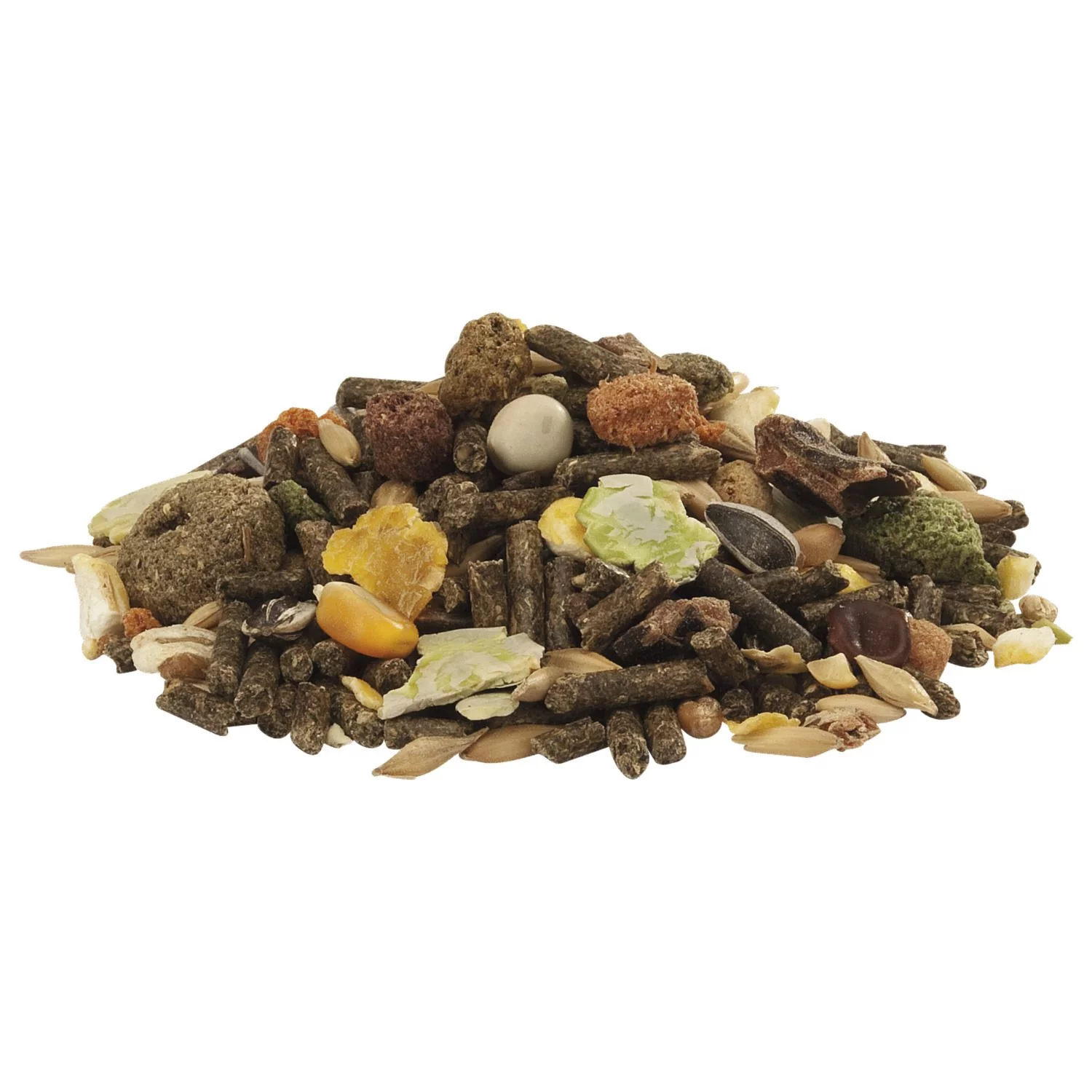 De muesli is een mengeling van konijnenkorrels met vlokken en granen zoals maïs, lijnzaad en zonnebloempitten om variatie in het voer aan te brengen. De aanwezigheid van prebiotica en vezels zorgt voor een optimaal werkende darmflora. Verder bevat het voer 100% natuurlijke grondstoffen en bevat het geen coccidiostaticum of andere toevoegingen.