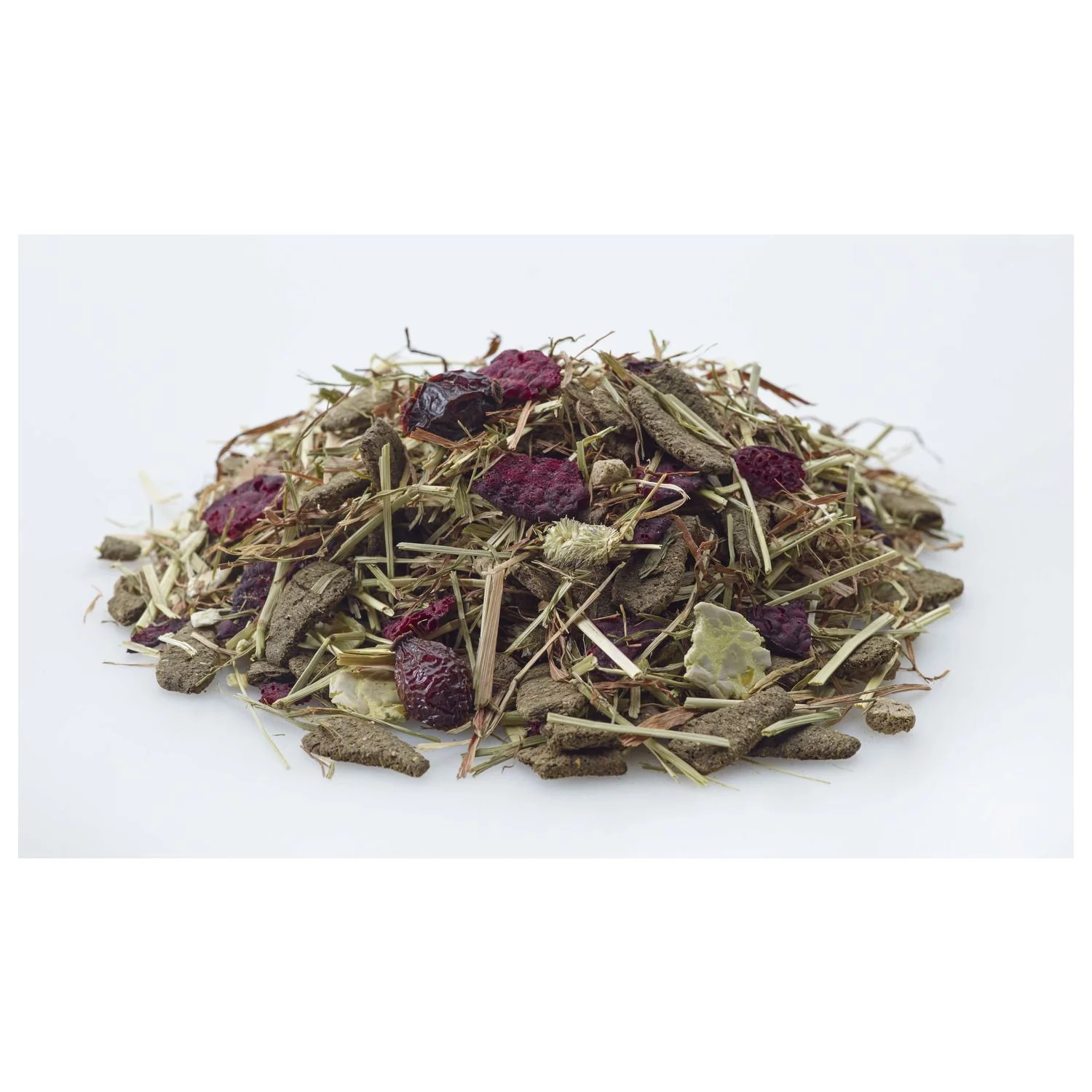 Plantaardige bijproducten (grassen en kruiden 28%: timothee, kropaar, Engels raaigras, veldbeemdgras, beemdlangbloem, rietzwenkgras, witte klaver, rode klaver, grote vossenstaart, smalle weegbree, paardenbloem, duizendblad), groenten (erwten 12,5%, rode biet 5,5%, wortelen 1,5%), vruchten (rozenbottel 1%), zaden, plantaardige eiwitextracten, mineralen, FOS, goudsbloem, MOS, algen, yucca