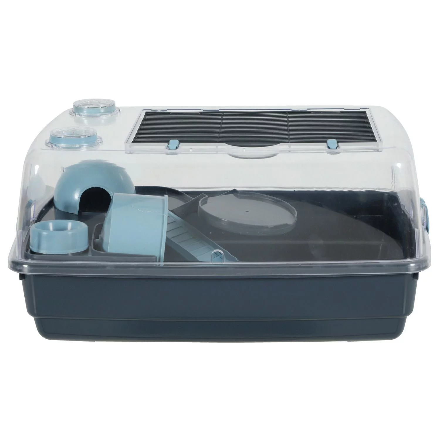 De bovenkant van de kooi is doorzichtig voor meer zichtbaarheid, de onderzijde is gemaakt van ondoorzichtig kunststof. De bovenkant is tevens afneembaar zodat je het hok makkelijk en snel kunt schoonmaken. Bovenop zit een traliedakje voor ventilatie en die je open kunt doen om bijvoorbeeld het voer te verversen.